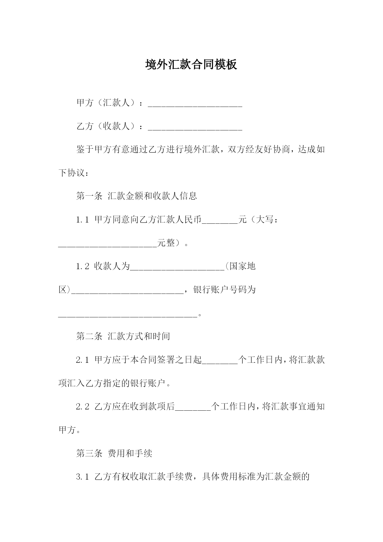 境外汇款合同模板甲方(汇款人):_____________________乙方(收款人):_____________________鉴于甲方有意通过乙方进行境外汇款,双方经友好协商,达成如下协议:第一条汇款金额和收款人信息1.1甲方同意向乙方汇款人民币________元(大写:______________________元整)。1.2收款人为_____________________(国家地区)_________________________,银行账户号码为_______________________