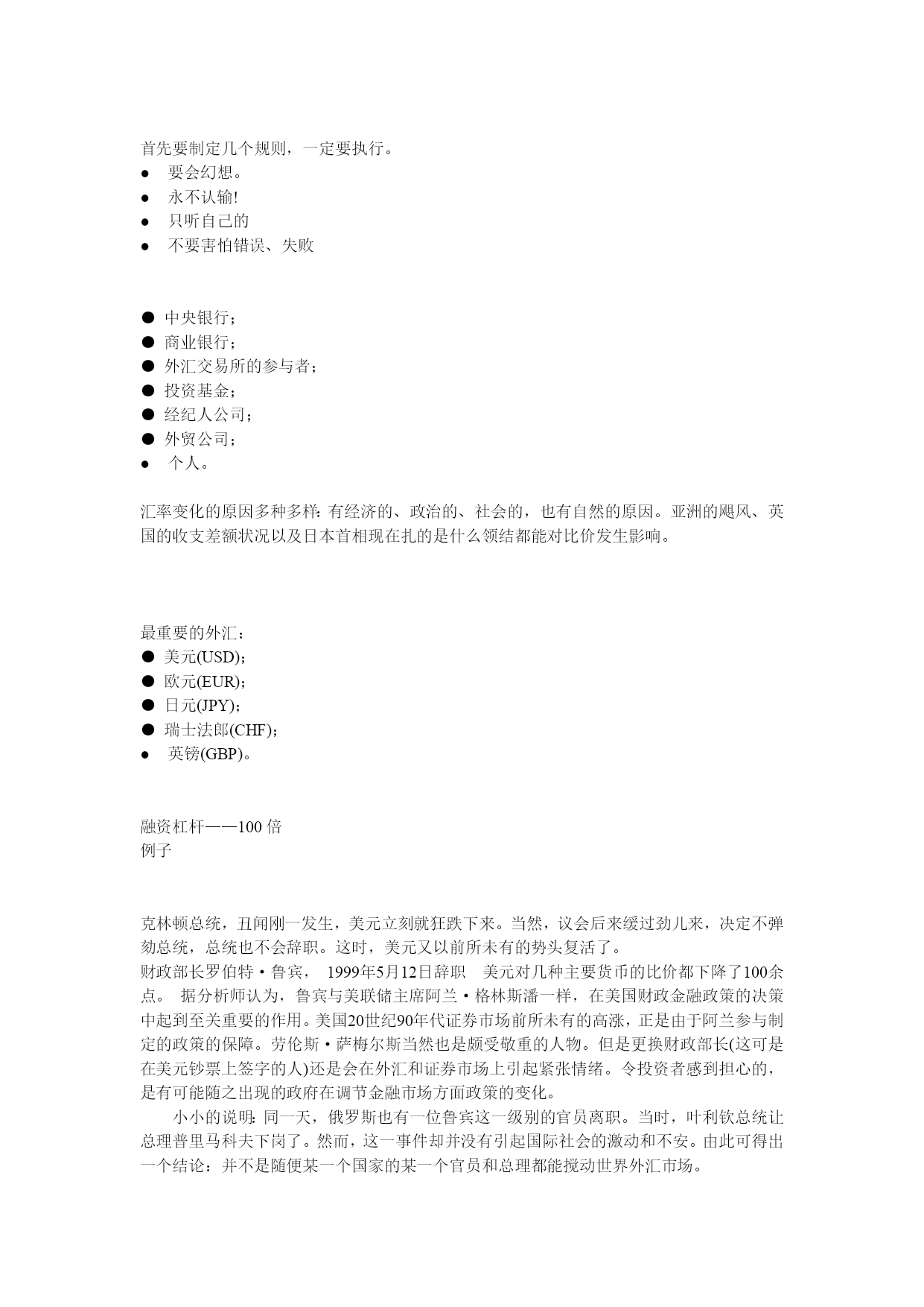 首先要制定几个规则,一定要执行。要会幻想。永不认输!只听自己的不要害怕错误、失败●中央银行;●商业银行;●外汇交易所的参与者;●投资基金;●经纪人公司;●外贸公司;个人。汇率变化的原因多种多样:有经济的、政治的、社会的,也有自然的原因。亚洲的飓风、英国的收支差额状况以及日本首相现在扎的是什么领结都能对比价发生影响。最重要的外汇:●美元(USD);●欧元(EUR);●日元(JPY);●瑞士法郎(CHF);英镑(GBP)。融资杠杆——100倍例子克林顿总统,丑闻刚一发生,美元立刻就狂跌下来。当然,议会后来缓过