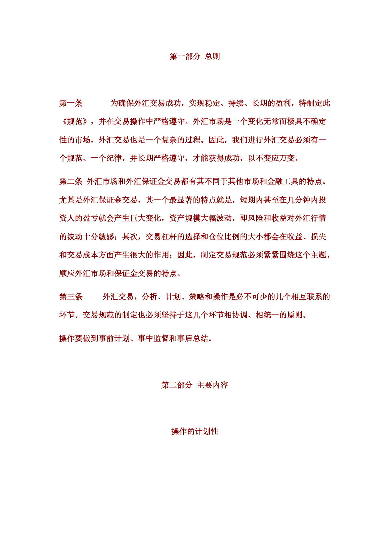第一部分总则第一条为确保外汇交易成功,实现稳定、持续、长期的盈利,特制定此《规范》,并在交易操作中严格遵守。外汇市场是一个变化无常而极具不确定性的市场,外汇交易也是一个复杂的过程。因此,我们进行外汇交易必须有一个规范、一个纪律,并长期严格遵守,才能获得成功,以不变应万变。第二条外汇市场和外汇保证金交易都有其不同于其他市场和金融工具的特点。尤其是外汇保证金交易,其一个最显著的特点就是,短期内甚至在几分钟内投资人的盈亏就会产生巨大变化,资产规模大幅波动,即风险和收益对外汇行情的波动十分敏感;其次,交易杠杆的选