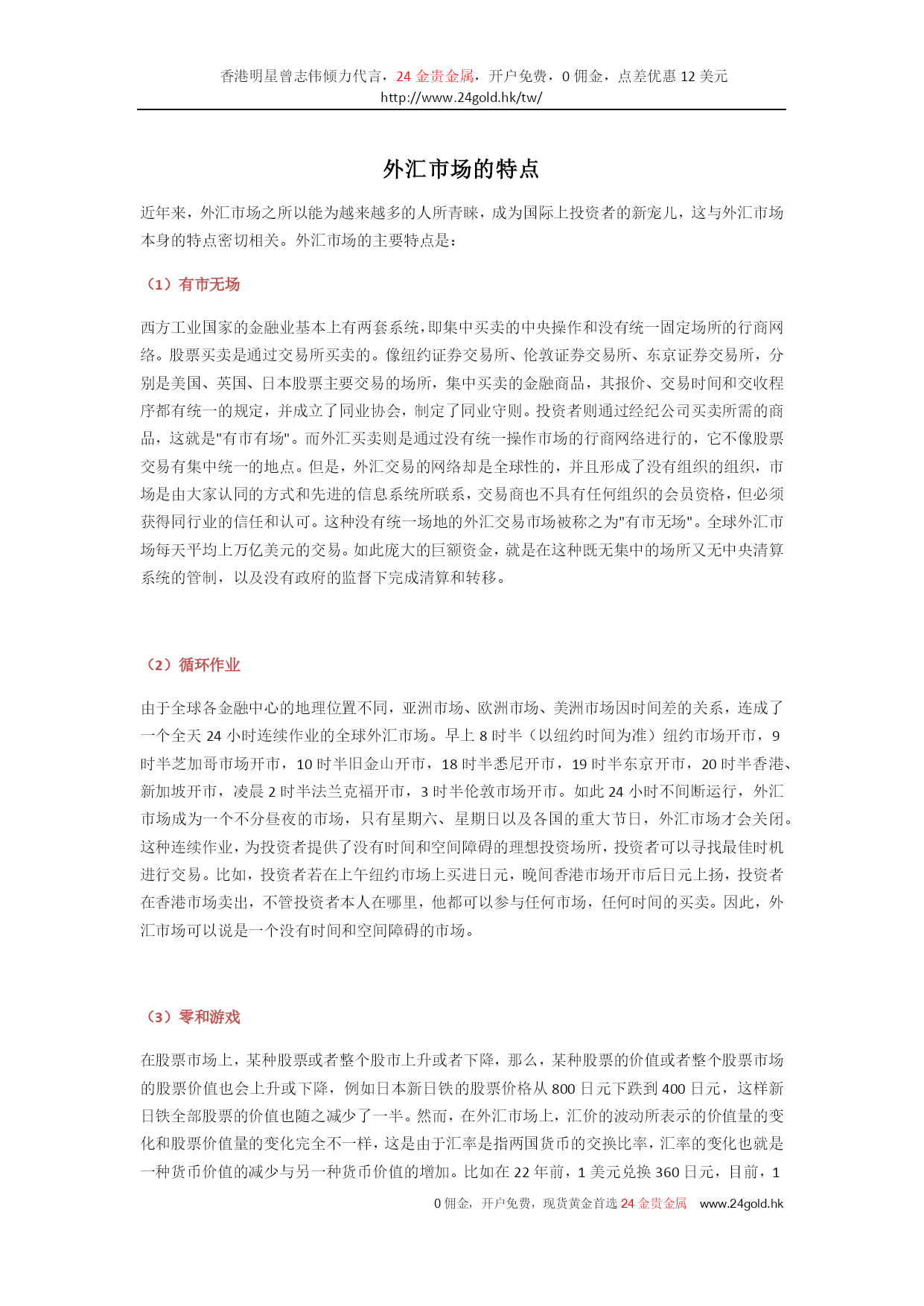 香港明星曾志伟倾力代言,24金贵金属,开户免费,0佣金,点差优惠12美元http://www.24gold.hk/tw/0佣金,开户免费,现货黄金首选24金贵金属www.24gold.hk外汇市场的特点近年来,外汇市场之所以能为越来越多的人所青睐,成为国际上投资者的新宠儿,这与外汇市场本身的特点密切相关。外汇市场的主要特点是:(1)有市无场西方工业国家的金融业基本上有两套系统,即集中买卖的中央操作和没有统一固定场所的行商网络。股票买卖是通过交易所买卖的。像纽约证券交易所、伦敦证券交易所、东京证券交易所,分