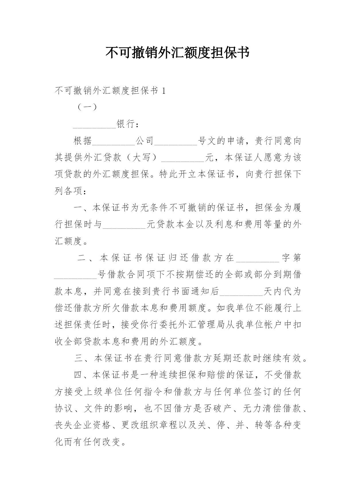 不可撤销外汇额度担保书不可撤销外汇额度担保书1(一)_________银行:根据_________公司_________号文的申请,贵行同意向其提供外汇贷款(大写)_________元,本保证人愿意为该项贷款的外汇额度担保。特此开立本保证书,向贵行担保下列各项:一、本保证书为无条件不可撤销的保证书,担保金为履行担保时与_________元贷款本金以及利息和费用等量的外汇额度。二、本保证书保证归还借款方在_________字第_________号借款合同项下不按期偿还的全部或部分到期借款本息,并同意在接到贵