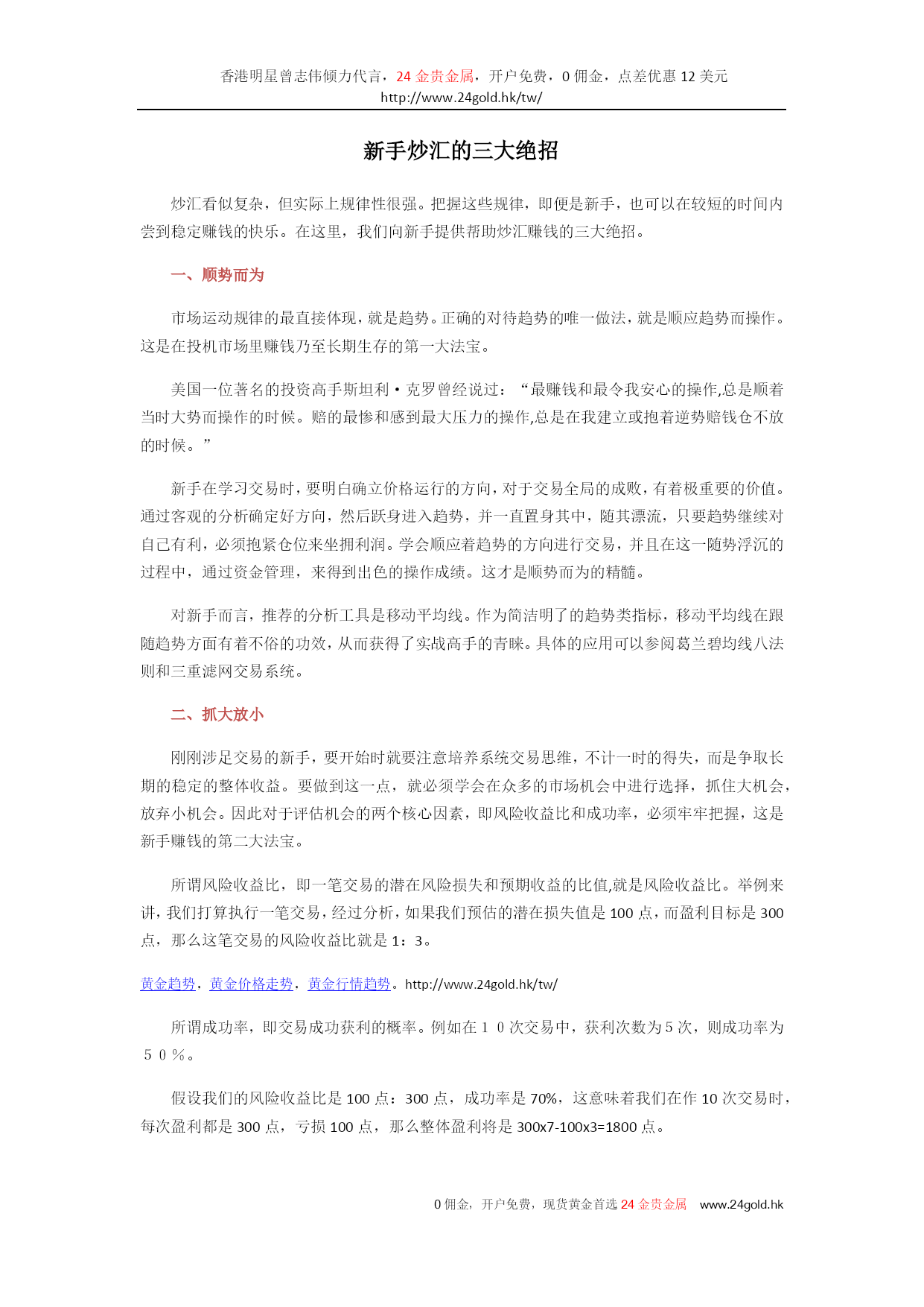 香港明星曾志伟倾力代言,24金贵金属,开户免费,0佣金,点差优惠12美元http://www.24gold.hk/tw/0佣金,开户免费,现货黄金首选24金贵金属www.24gold.hk新手炒汇的三大绝招炒汇看似复杂,但实际上规律性很强。把握这些规律,即便是新手,也可以在较短的时间内尝到稳定赚钱的快乐。在这里,我们向新手提供帮助炒汇赚钱的三大绝招。一、顺势而为市场运动规律的最直接体现,就是趋势。正确的对待趋势的唯一做法,就是顺应趋势而操作。这是在投机市场里赚钱乃至长期生存的第一大法宝。美国一位著名的投资
