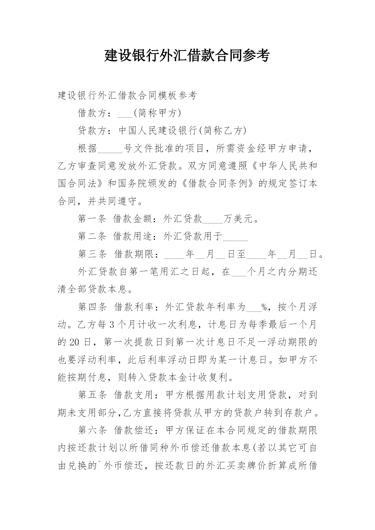 建设银行外汇借款合同参考建设银行外汇借款合同模板参考借款方:___(简称甲方)贷款方:中国人民建设银行(简称乙方)根据_____号文件批准的项目,所需资金经甲方申请,乙方审查同意发放外汇贷款。双方同意遵照《中华人民共和国合同法》和国务院颁发的《借款合同条例》的规定签订本合同,并共同遵守。第一条借款金额:外汇贷款____万美元。第二条借款用途:外汇贷款用于_____第三条借款期限:____年__月__日至____年__月__日。外汇贷款自第一笔用汇之日起,在___个月之内分期还清全部贷款本息。第四条借款利率