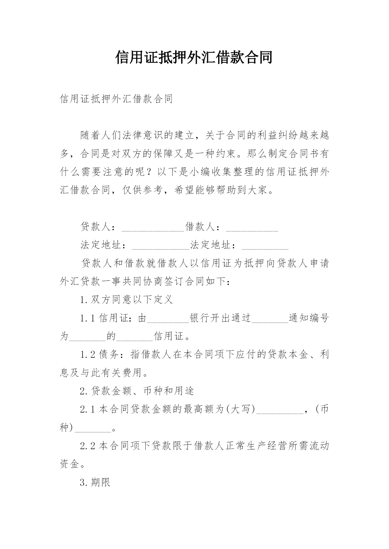 信用证抵押外汇借款合同信用证抵押外汇借款合同随着人们法律意识的建立,关于合同的利益纠纷越来越多,合同是对双方的保障又是一种约束。那么制定合同书有什么需要注意的呢?以下是小编收集整理的信用证抵押外汇借款合同,仅供参考,希望能够帮助到大家。贷款人:____________借款人:__________法定地址:___________法定地址:_________贷款人和借款就借款人以信用证为抵押向贷款人申请外汇贷款一事共同协商签订合同如下:1.双方同意以下定义1.1信用证:由________银行开出通过_____