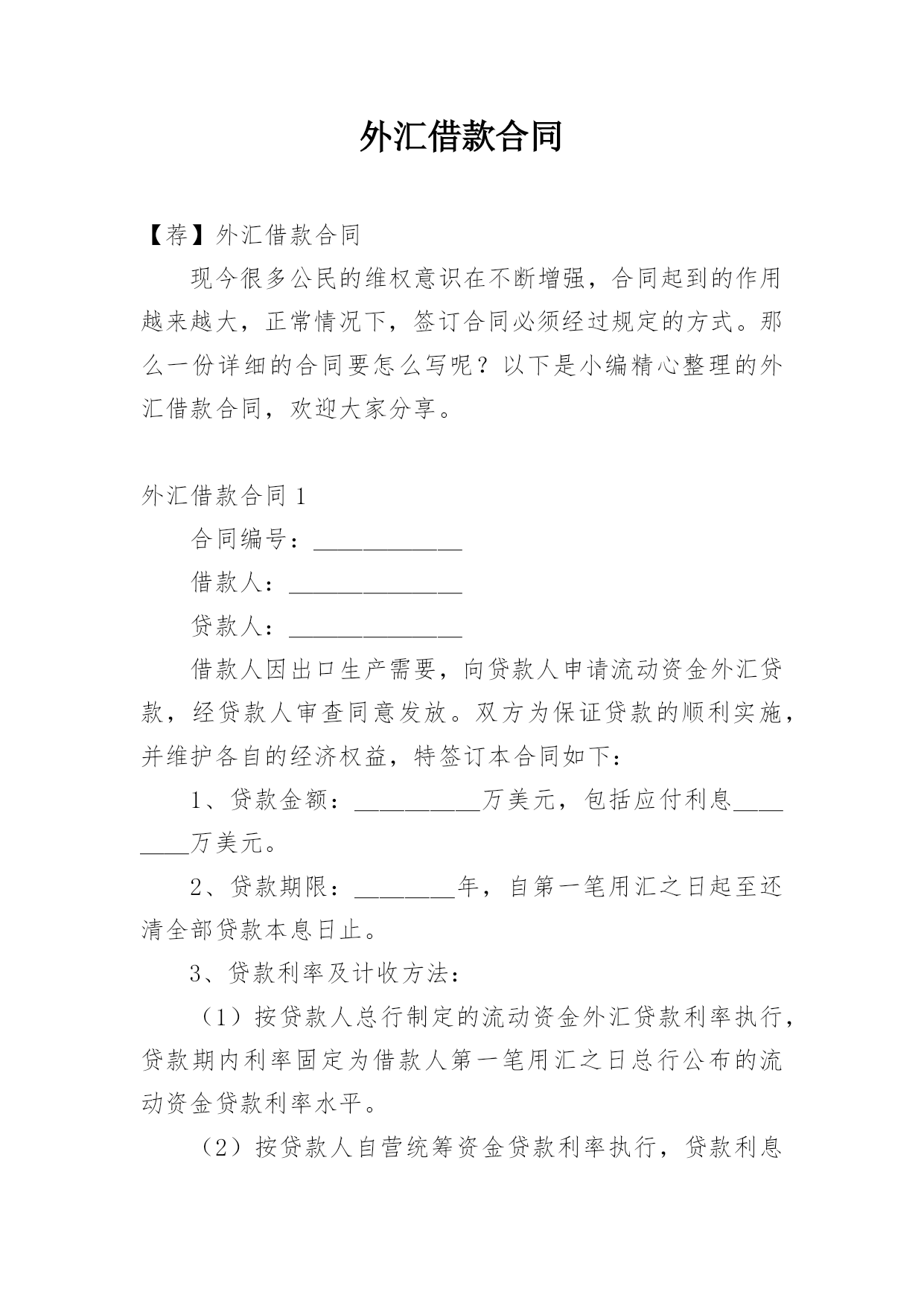 外汇借款合同【荐】外汇借款合同现今很多公民的维权意识在不断增强,合同起到的作用越来越大,正常情况下,签订合同必须经过规定的方式。那么一份详细的合同要怎么写呢?以下是小编精心整理的外汇借款合同,欢迎大家分享。外汇借款合同1合同编号:______借款人:_______贷款人:_______借款人因出口生产需要,向贷款人申请流动资金外汇贷款,经贷款人审查同意发放。双方为保证贷款的顺利实施,并维护各自的经济权益,特签订本合同如下:1、贷款金额:_____万美元,包括应付利息____万美元。2、贷款期限:____年