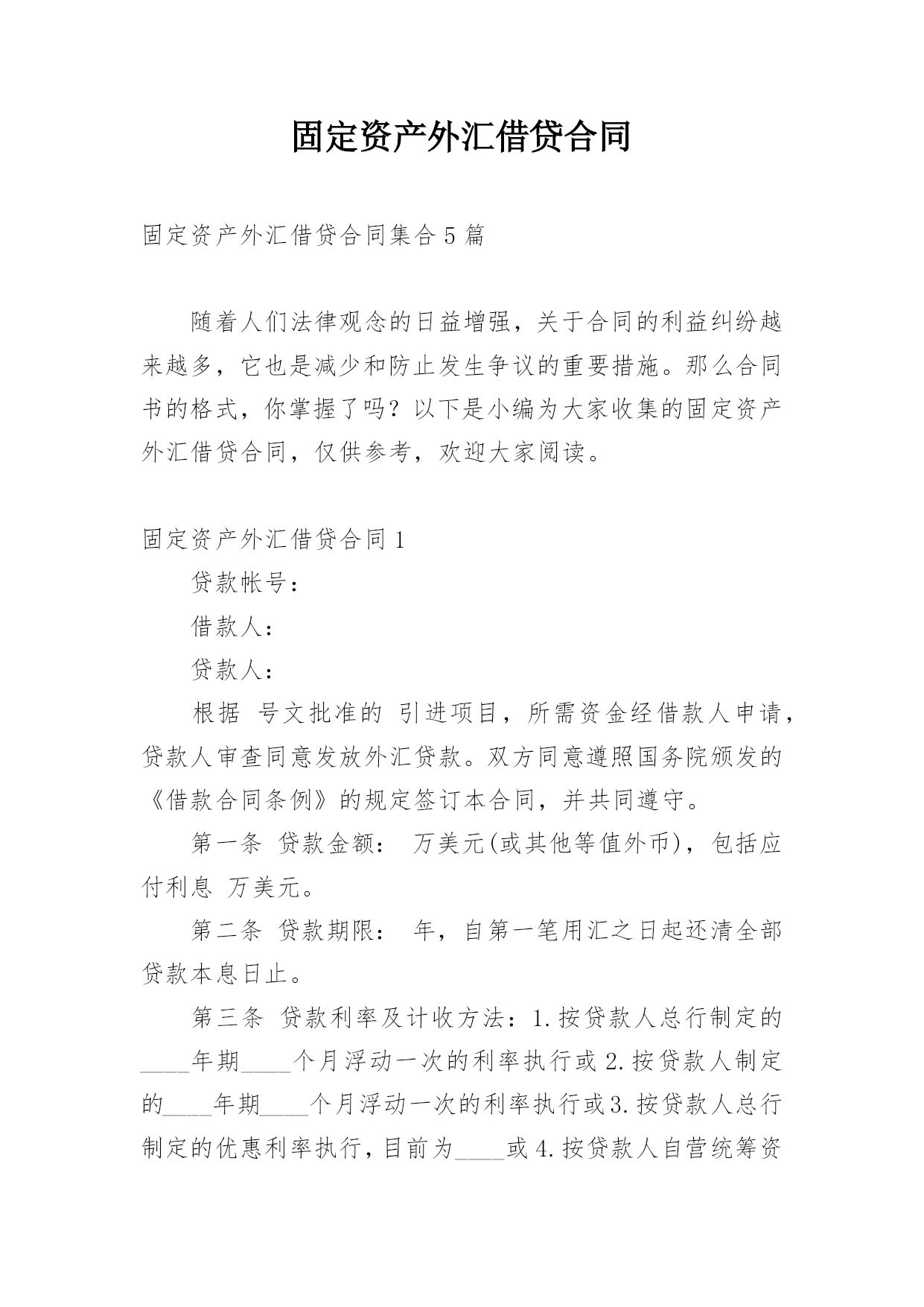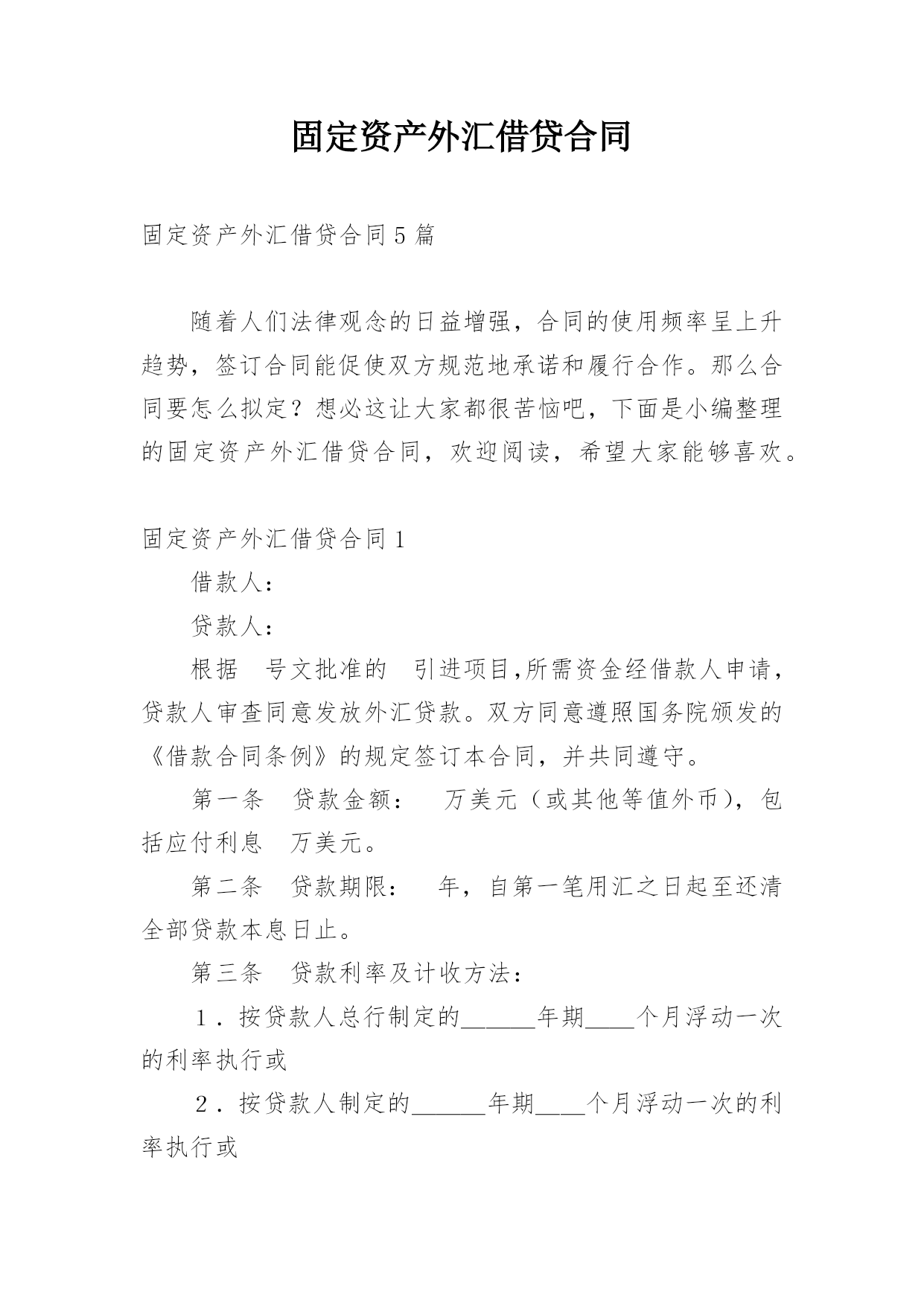 固定资产外汇借贷合同固定资产外汇借贷合同5篇随着人们法律观念的日益增强,合同的使用频率呈上升趋势,签订合同能促使双方规范地承诺和履行合作。那么合同要怎么拟定?想必这让大家都很苦恼吧,下面是小编整理的固定资产外汇借贷合同,欢迎阅读,希望大家能够喜欢。固定资产外汇借贷合同1借款人:贷款人:根据号文批准的引进项目,所需资金经借款人申请,贷款人审查同意发放外汇贷款。双方同意遵照国务院颁发的《借款合同条例》的规定签订本合同,并共同遵守。第一条贷款金额:万美元(或其他等值外币),包括应付利息万美元。第二条贷款期限:年