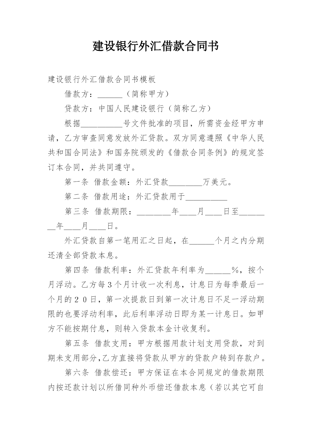 建设银行外汇借款合同书建设银行外汇借款合同书模板借款方:___(简称甲方)贷款方:中国人民建设银行(简称乙方)根据_____号文件批准的项目,所需资金经甲方申请,乙方审查同意发放外汇贷款。双方同意遵照《中华人民共和国合同法》和国务院颁发的《借款合同条例》的规定签订本合同,并共同遵守。第一条借款金额:外汇贷款____万美元。第二条借款用途:外汇贷款用于_____第三条借款期限:____年__月__日至____年__月__日。外汇贷款自第一笔用汇之日起,在___个月之内分期还清全部贷款本息。第四条借款利率:外