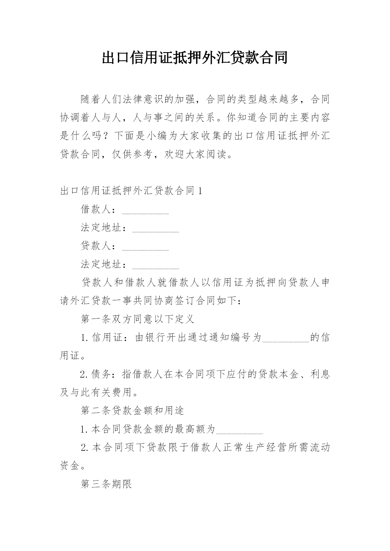 出口信用证抵押外汇贷款合同随着人们法律意识的加强,合同的类型越来越多,合同协调着人与人,人与事之间的关系。你知道合同的主要内容是什么吗?下面是小编为大家收集的出口信用证抵押外汇贷款合同,仅供参考,欢迎大家阅读。出口信用证抵押外汇贷款合同1借款人:_________法定地址:_________贷款人:_________法定地址:_________贷款人和借款人就借款人以信用证为抵押向贷款人申请外汇贷款一事共同协商签订合同如下:第一条双方同意以下定义1.信用证:由银行开出通过通知编号为_________的信用