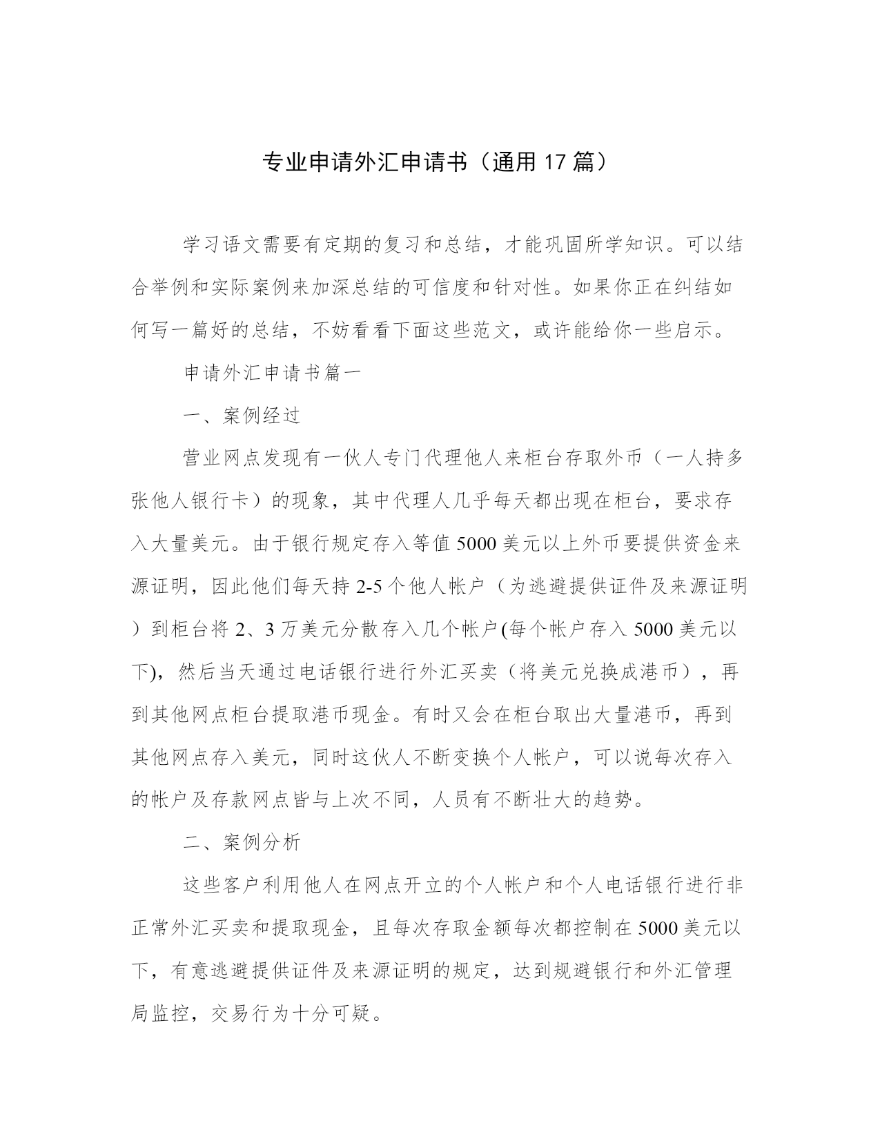 专业申请外汇申请书(通用17篇)学习语文需要有定期的复习和总结,才能巩固所学知识。可以结合举例和实际案例来加深总结的可信度和针对性。如果你正在纠结如何写一篇好的总结,不妨看看下面这些范文,或许能给你一些启示。申请外汇申请书篇一一、案例经过营业网点发现有一伙人专门代理他人来柜台存取外币(一人持多张他人银行卡)的现象,其中代理人几乎每天都出现在柜台,要求存入大量美元。由于银行规定存入等值5000美元以上外币要提供资金来源证明,因此他们每天持2-5个他人帐户(为逃避提供证件及来源证明)到柜台将2、3万美元分散存
