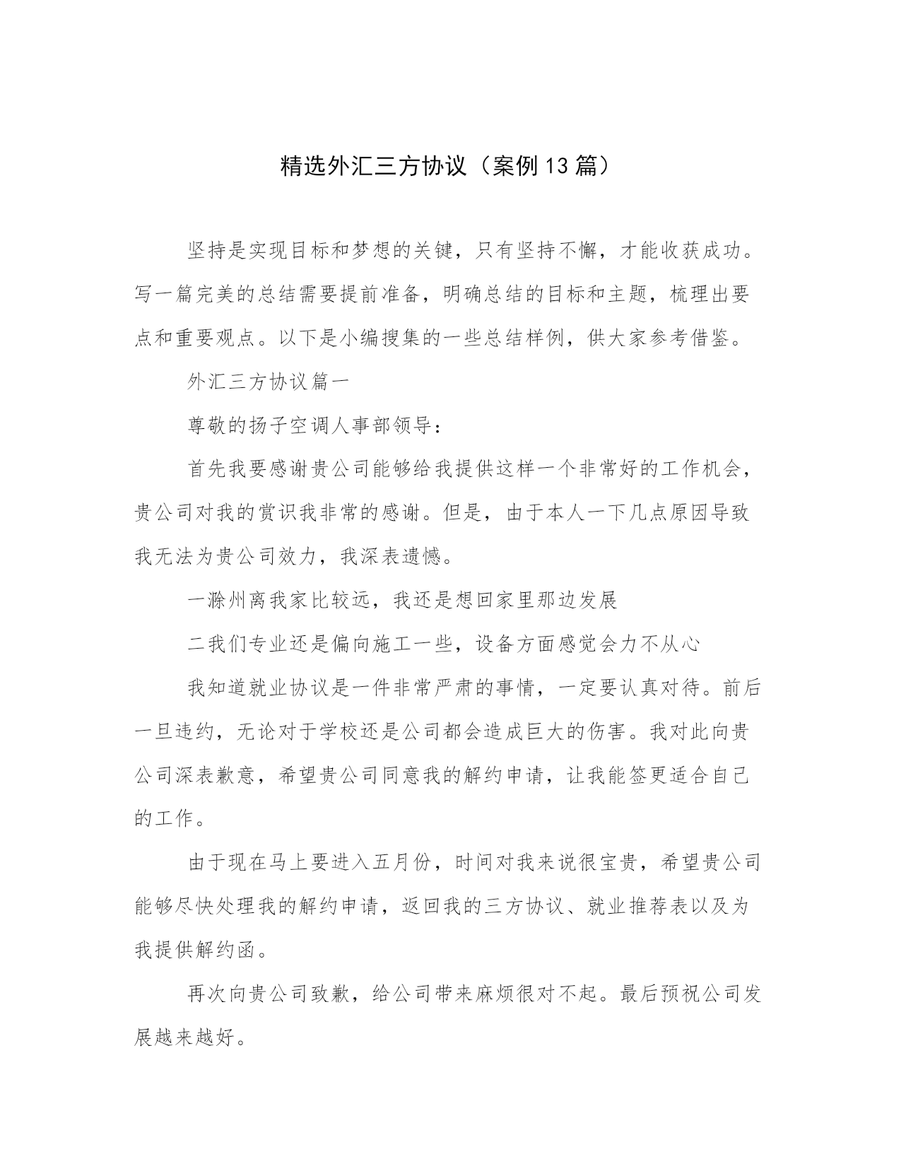 精选外汇三方协议(案例13篇)坚持是实现目标和梦想的关键,只有坚持不懈,才能收获成功。写一篇完美的总结需要提前准备,明确总结的目标和主题,梳理出要点和重要观点。以下是小编搜集的一些总结样例,供大家参考借鉴。外汇三方协议篇一尊敬的扬子空调人事部领导:首先我要感谢贵公司能够给我提供这样一个非常好的工作机会,贵公司对我的赏识我非常的感谢。但是,由于本人一下几点原因导致我无法为贵公司效力,我深表遗憾。一滁州离我家比较远,我还是想回家里那边发展二我们专业还是偏向施工一些,设备方面感觉会力不从心我知道就业协议是一件非