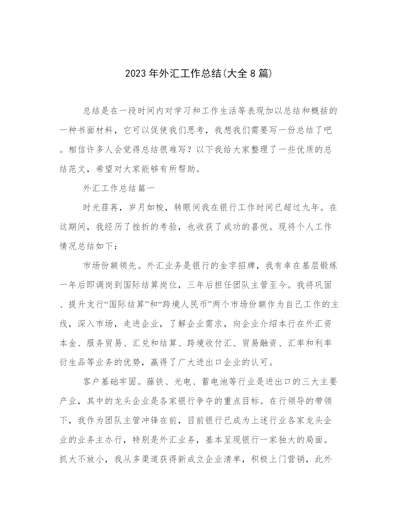 2023年外汇工作总结(大全8篇)总结是在一段时间内对学习和工作生活等表现加以总结和概括的一种书面材料,它可以促使我们思考,我想我们需要写一份总结了吧。相信许多人会觉得总结很难写?以下我给大家整理了一些优质的总结范文,希望对大家能够有所帮助。外汇工作总结篇一时光荏苒,岁月如梭,转眼间我在银行工作时间已超过九年。在这期间,我经历了挫折的考验,也收获了成功的喜悦。现将个人工作情况总结如下:市场份额领先。外汇业务是银行的金字招牌,我有幸在基层锻炼一年后即调岗到国际结算岗位,三年后担任团队主管至今。我将巩固、提升