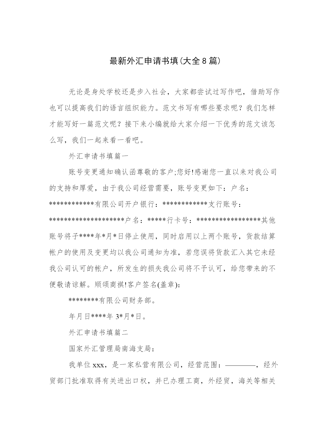 最新外汇申请书填(大全8篇)无论是身处学校还是步入社会,大家都尝试过写作吧,借助写作也可以提高我们的语言组织能力。范文书写有哪些要求呢?我们怎样才能写好一篇范文呢?接下来小编就给大家介绍一下优秀的范文该怎么写,我们一起来看一看吧。外汇申请书填篇一账号变更通知确认函尊敬的客户;您好!感谢您一直以来对我公司的支持和厚爱,由于我公司经营需要,账号变更如下:户名:************有限公司开户银行:************支行账号:********************户名:*****行卡号:******