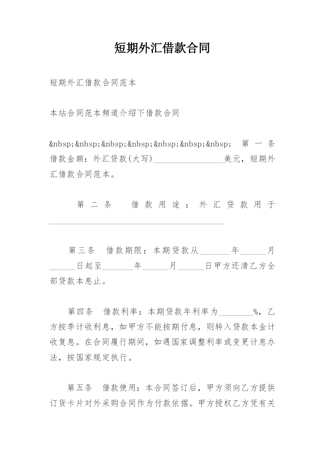 短期外汇借款合同短期外汇借款合同范本本站合同范本频道介绍下借款合同 第一条借款金额:外汇贷款(大写)________________美元,短期外汇借款合同范本。第二条借款用途:外汇贷款用于________________________________________第三条借款期限:本期贷款从_______年______月______日起至_______年______月______日甲方还清乙方全部贷款本息止。第四条借款利率