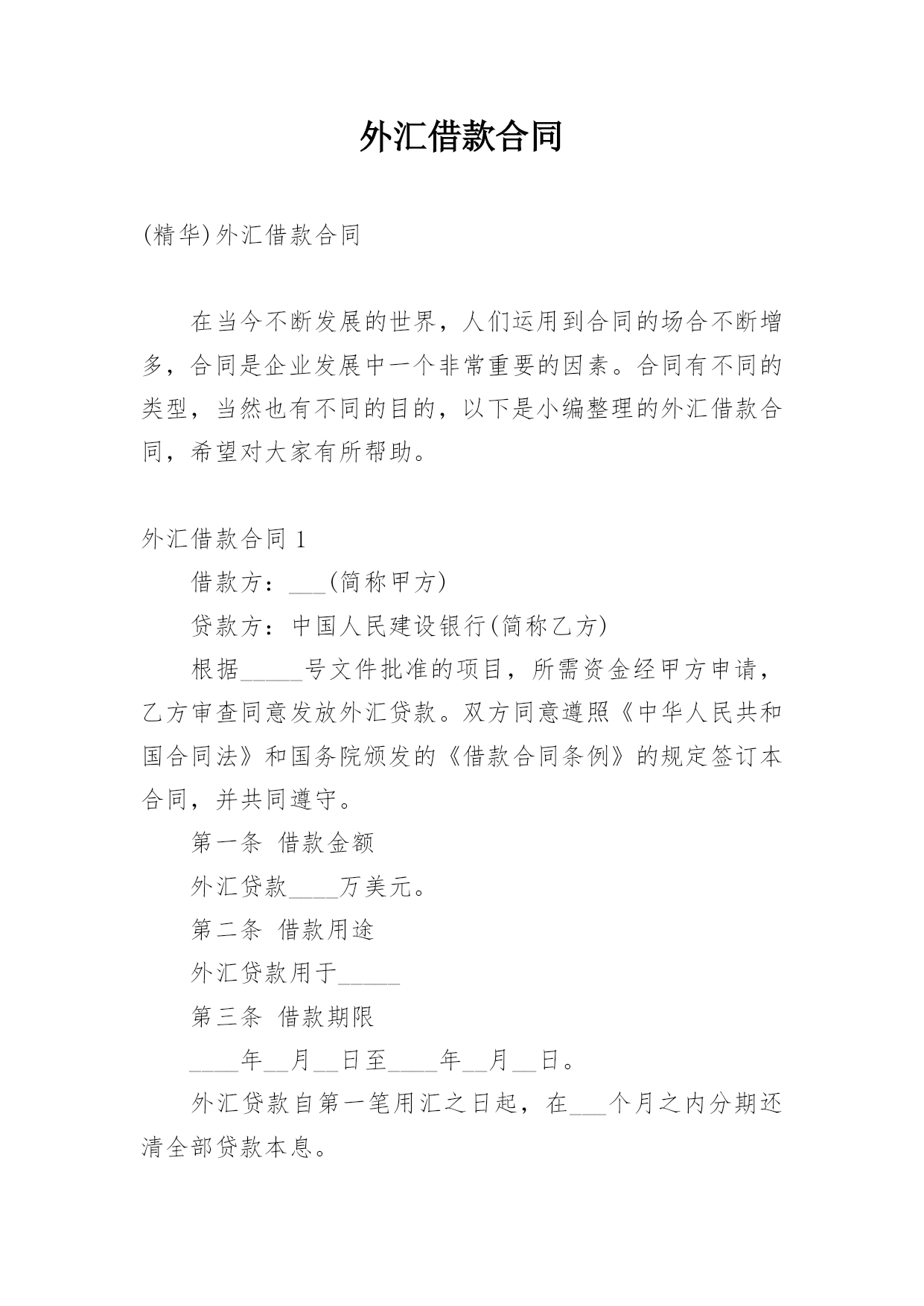 外汇借款合同(精华)外汇借款合同在当今不断发展的世界,人们运用到合同的场合不断增多,合同是企业发展中一个非常重要的因素。合同有不同的类型,当然也有不同的目的,以下是小编整理的外汇借款合同,希望对大家有所帮助。外汇借款合同1借款方:___(简称甲方)贷款方:中国人民建设银行(简称乙方)根据_____号文件批准的项目,所需资金经甲方申请,乙方审查同意发放外汇贷款。双方同意遵照《中华人民共和国合同法》和国务院颁发的《借款合同条例》的规定签订本合同,并共同遵守。第一条借款金额外汇贷款____万美元。第二条借款用途