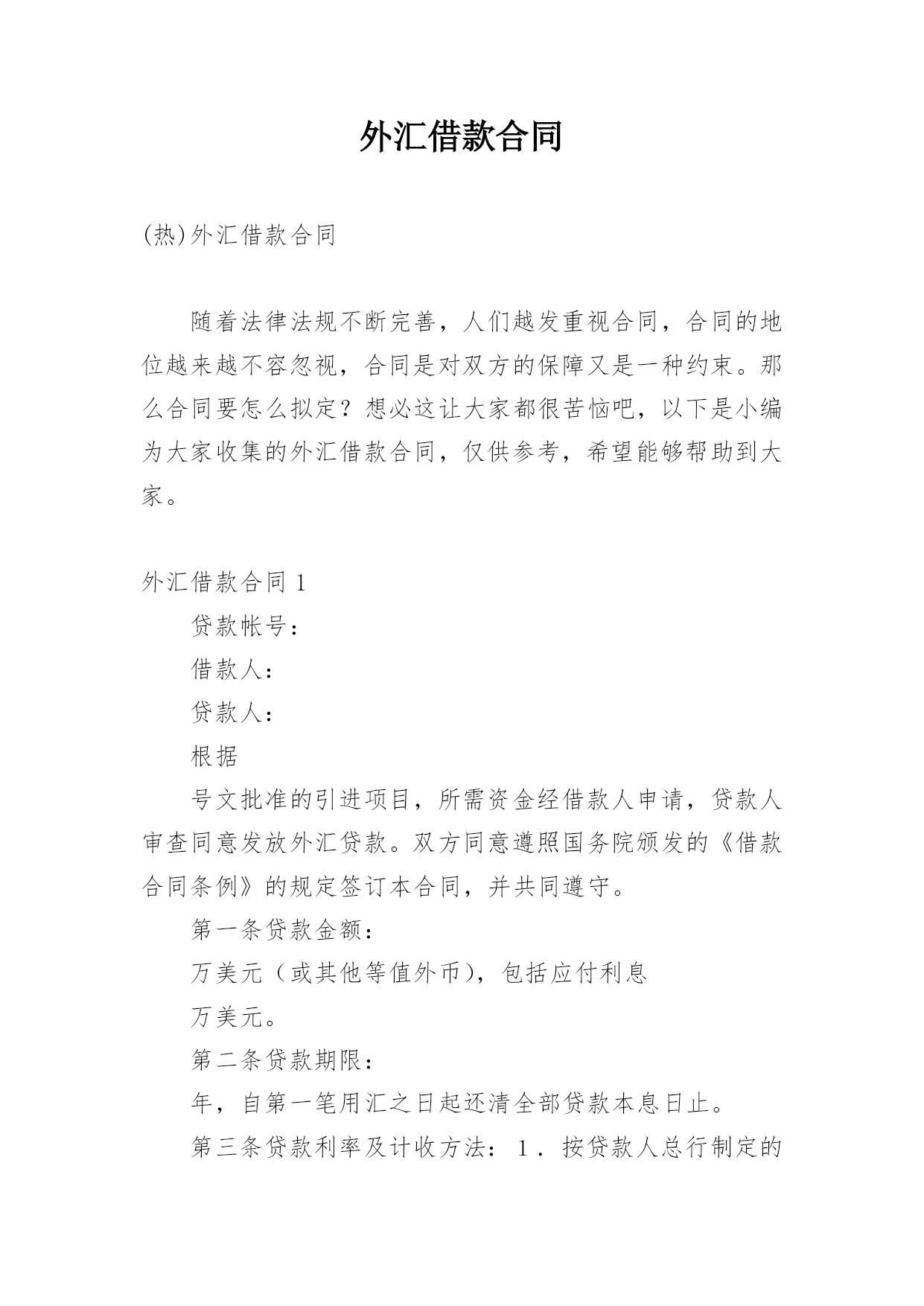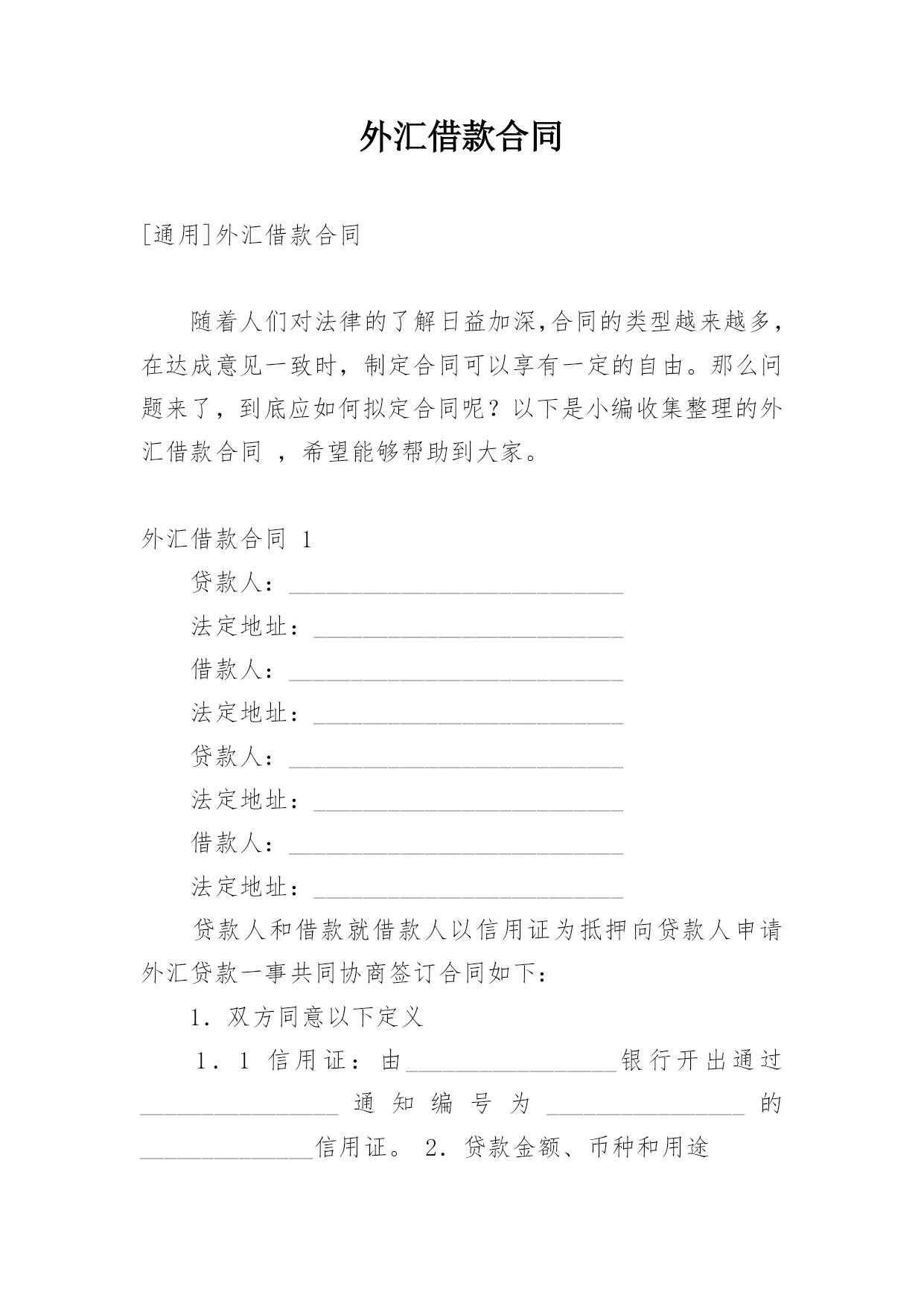 外汇借款合同[通用]外汇借款合同随着人们对法律的了解日益加深,合同的类型越来越多,在达成意见一致时,制定合同可以享有一定的自由。那么问题来了,到底应如何拟定合同呢?以下是小编收集整理的外汇借款合同,希望能够帮助到大家。外汇借款合同1贷款人:___________________________法定地址:_________________________借款人:___________________________法定地址:_________________________贷款人:_____________