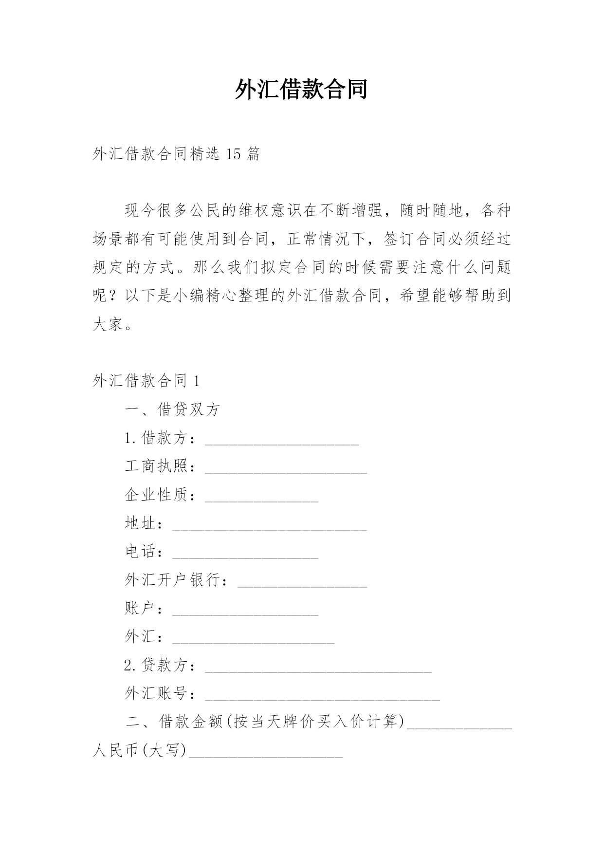 外汇借款合同外汇借款合同精选15篇现今很多公民的维权意识在不断增强,随时随地,各种场景都有可能使用到合同,正常情况下,签订合同必须经过规定的方式。那么我们拟定合同的时候需要注意什么问题呢?以下是小编精心整理的外汇借款合同,希望能够帮助到大家。外汇借款合同1一、借贷双方1.借款方:___________________工商执照:____________________企业性质:______________地址:________________________电话:__________________外汇开户