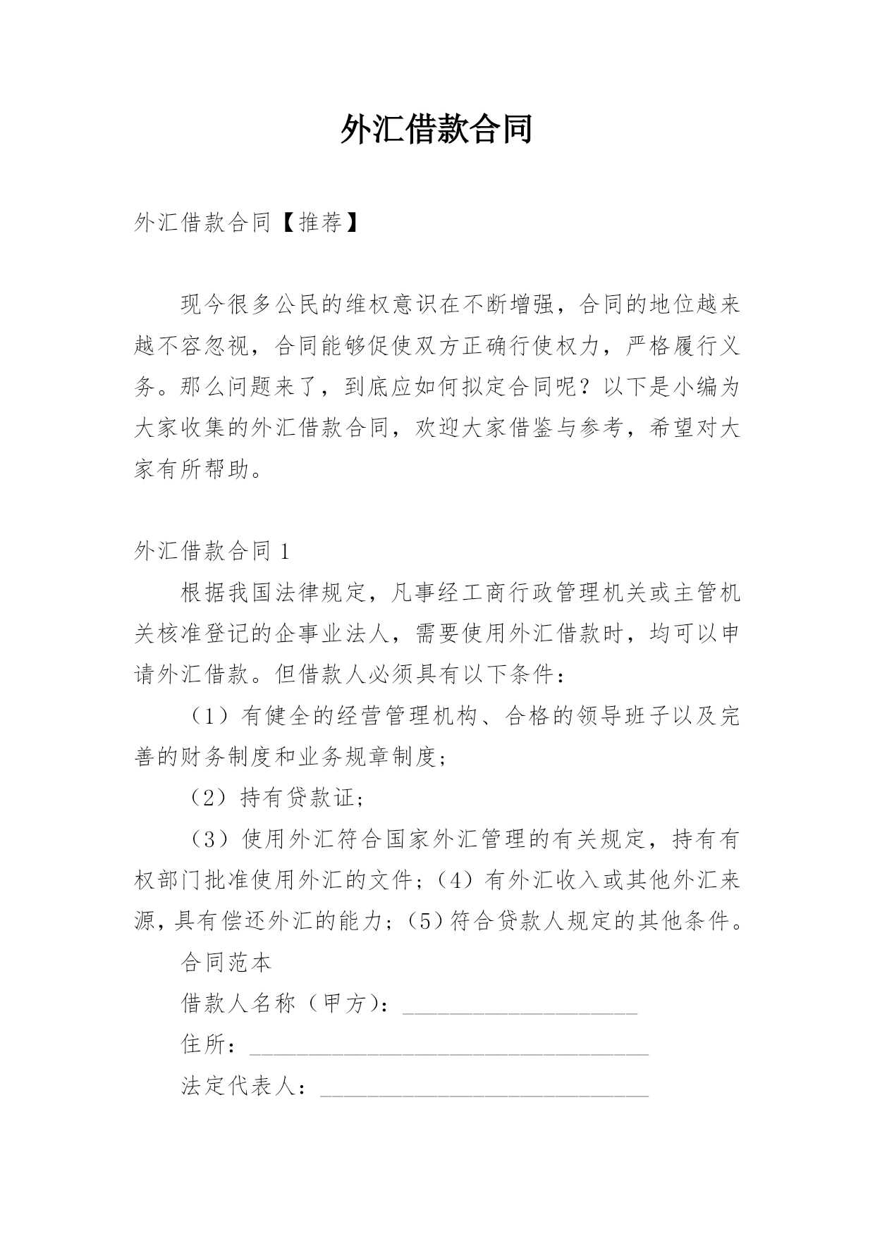 外汇借款合同外汇借款合同【推荐】现今很多公民的维权意识在不断增强,合同的地位越来越不容忽视,合同能够促使双方正确行使权力,严格履行义务。那么问题来了,到底应如何拟定合同呢?以下是小编为大家收集的外汇借款合同,欢迎大家借鉴与参考,希望对大家有所帮助。外汇借款合同1根据我国法律规定,凡事经工商行政管理机关或主管机关核准登记的企事业法人,需要使用外汇借款时,均可以申请外汇借款。但借款人必须具有以下条件:(1)有健全的经营管理机构、合格的领导班子以及完善的财务制度和业务规章制度;(2)持有贷款证;(3)使用外汇符