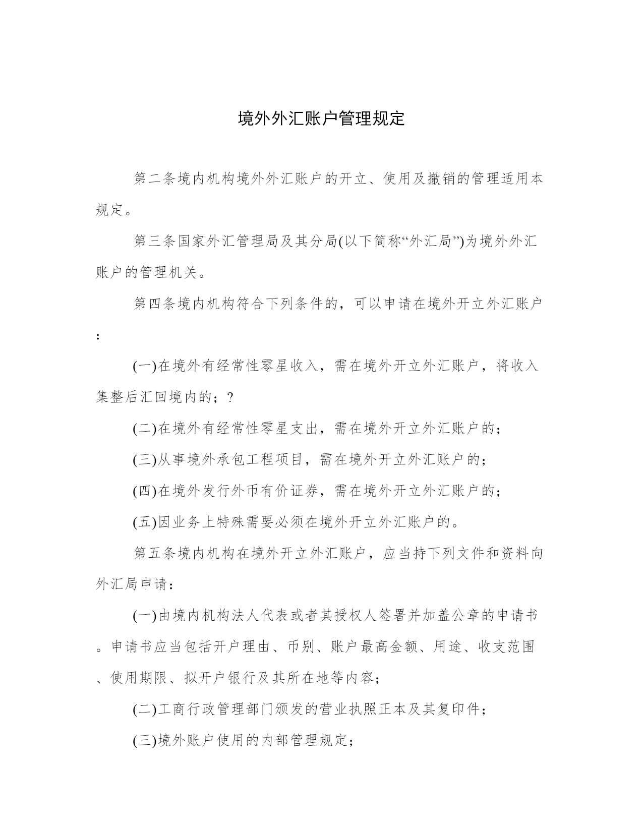 境外外汇账户管理规定第二条境内机构境外外汇账户的开立、使用及撤销的管理适用本规定。第三条国家外汇管理局及其分局(以下简称“外汇局”)为境外外汇账户的管理机关。第四条境内机构符合下列条件的,可以申请在境外开立外汇账户:(一)在境外有经常性零星收入,需在境外开立外汇账户,将收入集整后汇回境内的;?(二)在境外有经常性零星支出,需在境外开立外汇账户的;(三)从事境外承包工程项目,需在境外开立外汇账户的;(四)在境外发行外币有价证券,需在境外开立外汇账户的;(五)因业务上特殊需要必须在境外开立外汇账户的。第五条境