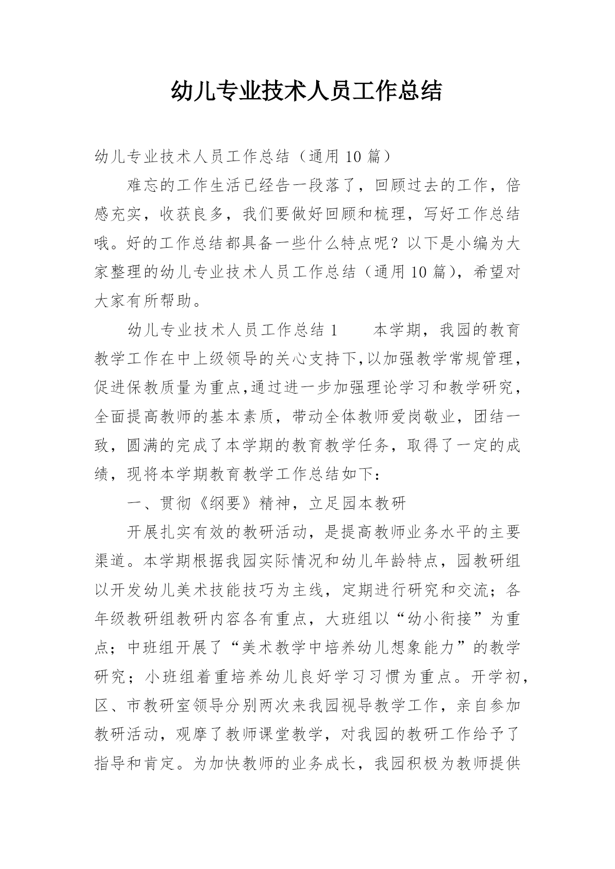 幼儿专业技术人员工作总结幼儿专业技术人员工作总结(通用10篇)难忘的工作生活已经告一段落了,回顾过去的工作,倍感充实,收获良多,我们要做好回顾和梳理,写好工作总结哦。好的工作总结都具备一些什么特点呢?以下是小编为大家整理的幼儿专业技术人员工作总结(通用10篇),希望对大家有所帮助。幼儿专业技术人员工作总结1本学期,我园的教育教学工作在中上级领导的关心支持下,以加强教学常规管理,促进保教质量为重点,通过进一步加强理论学习和教学研究,全面提高教师的基本素质,带动全体教师爱岗敬业,团结一致,圆满的完成了本学期的