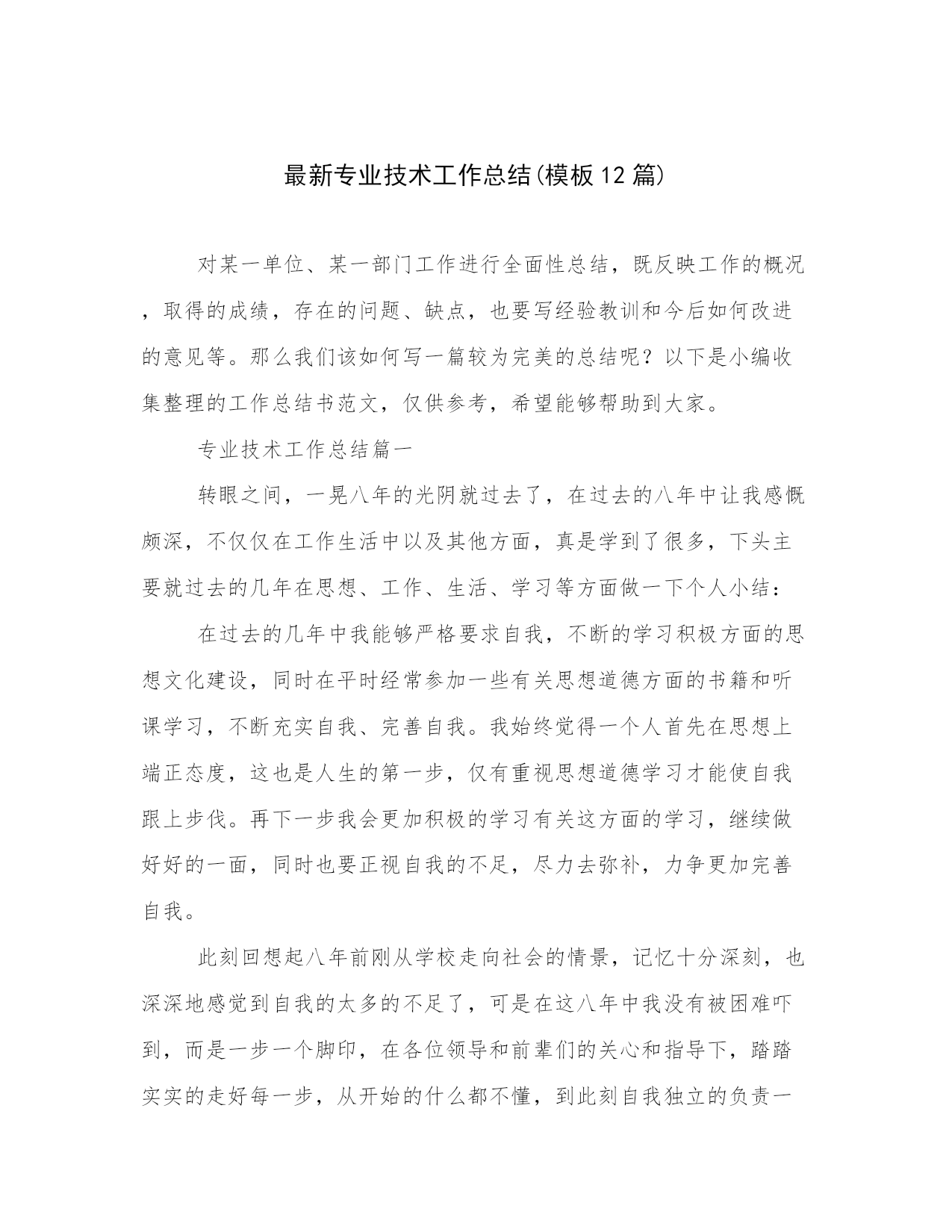 最新专业技术工作总结(模板12篇)对某一单位、某一部门工作进行全面性总结,既反映工作的概况,取得的成绩,存在的问题、缺点,也要写经验教训和今后如何改进的意见等。那么我们该如何写一篇较为完美的总结呢?以下是小编收集整理的工作总结书范文,仅供参考,希望能够帮助到大家。专业技术工作总结篇一转眼之间,一晃八年的光阴就过去了,在过去的八年中让我感慨颇深,不仅仅在工作生活中以及其他方面,真是学到了很多,下头主要就过去的几年在思想、工作、生活、学习等方面做一下个人小结:在过去的几年中我能够严格要求自我,不断的学习积极方