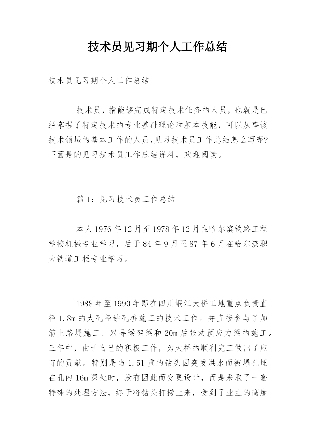 技术员见习期个人工作总结技术员见习期个人工作总结技术员,指能够完成特定技术任务的人员,也就是已经掌握了特定技术的专业基础理论和基本技能,可以从事该技术领域的基本工作的人员,见习技术员工作总结怎么写呢?下面是的见习技术员工作总结资料,欢迎阅读。篇1:见习技术员工作总结本人1976年12月至1978年12月在哈尔滨铁路工程学校机械专业学习,后于84年9月至87年6月在哈尔滨职大铁道工程专业学习。1988年至1990年即在四川岷江大桥工地重点负责直径1.8m的大孔径钻孔桩施工的技术工作。并直接参与了加筋土路堤施