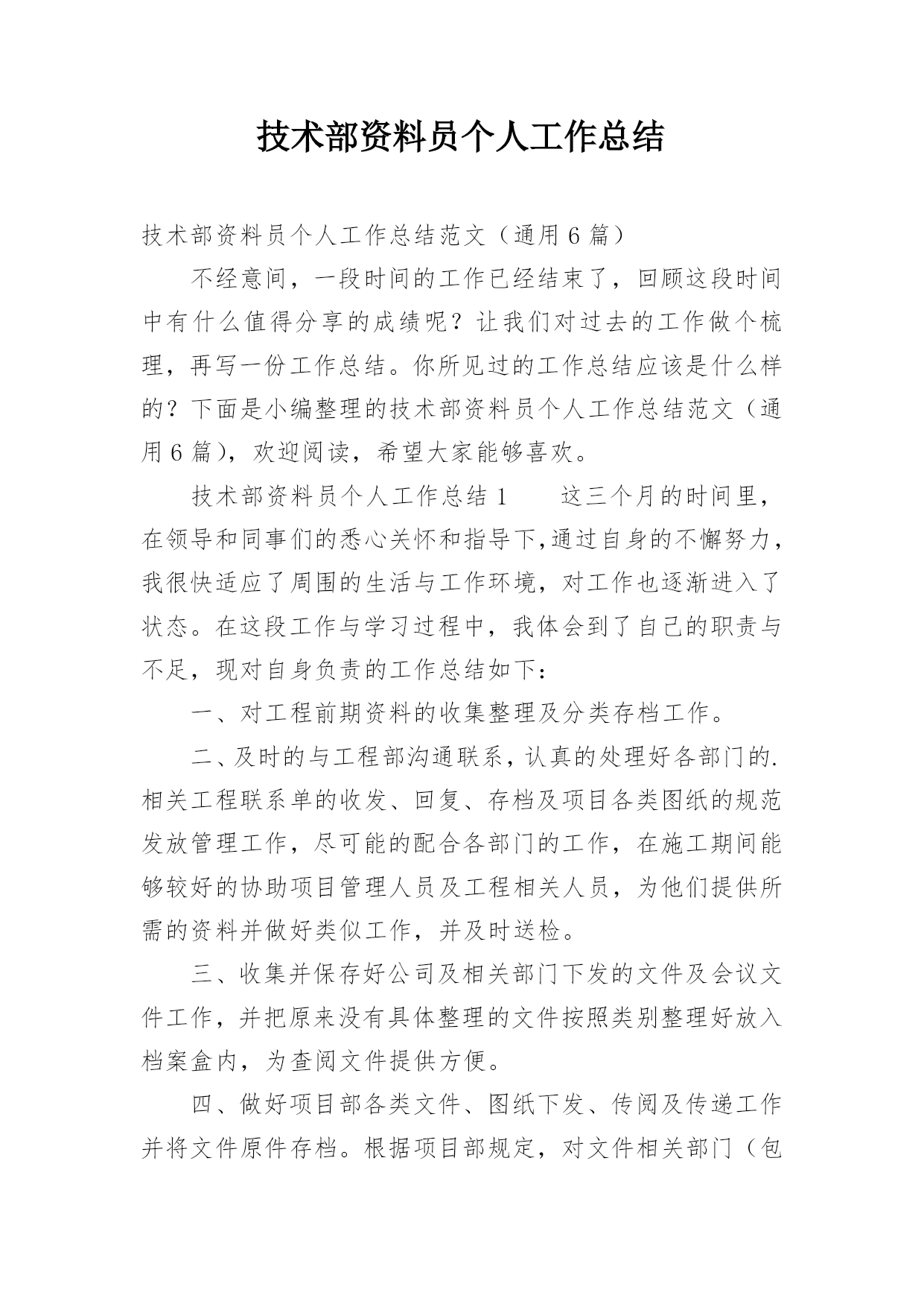 技术部资料员个人工作总结技术部资料员个人工作总结范文(通用6篇)不经意间,一段时间的工作已经结束了,回顾这段时间中有什么值得分享的成绩呢?让我们对过去的工作做个梳理,再写一份工作总结。你所见过的工作总结应该是什么样的?下面是小编整理的技术部资料员个人工作总结范文(通用6篇),欢迎阅读,希望大家能够喜欢。技术部资料员个人工作总结1这三个月的时间里,在领导和同事们的悉心关怀和指导下,通过自身的不懈努力,我很快适应了周围的生活与工作环境,对工作也逐渐进入了状态。在这段工作与学习过程中,我体会到了自己的职责与不足