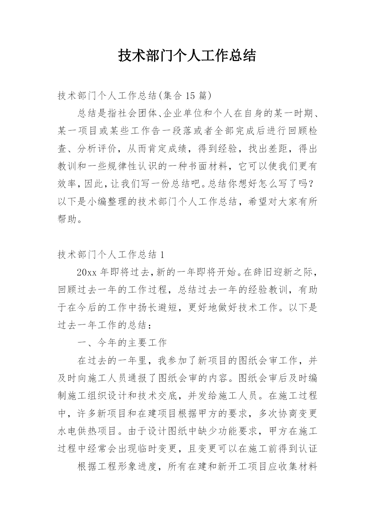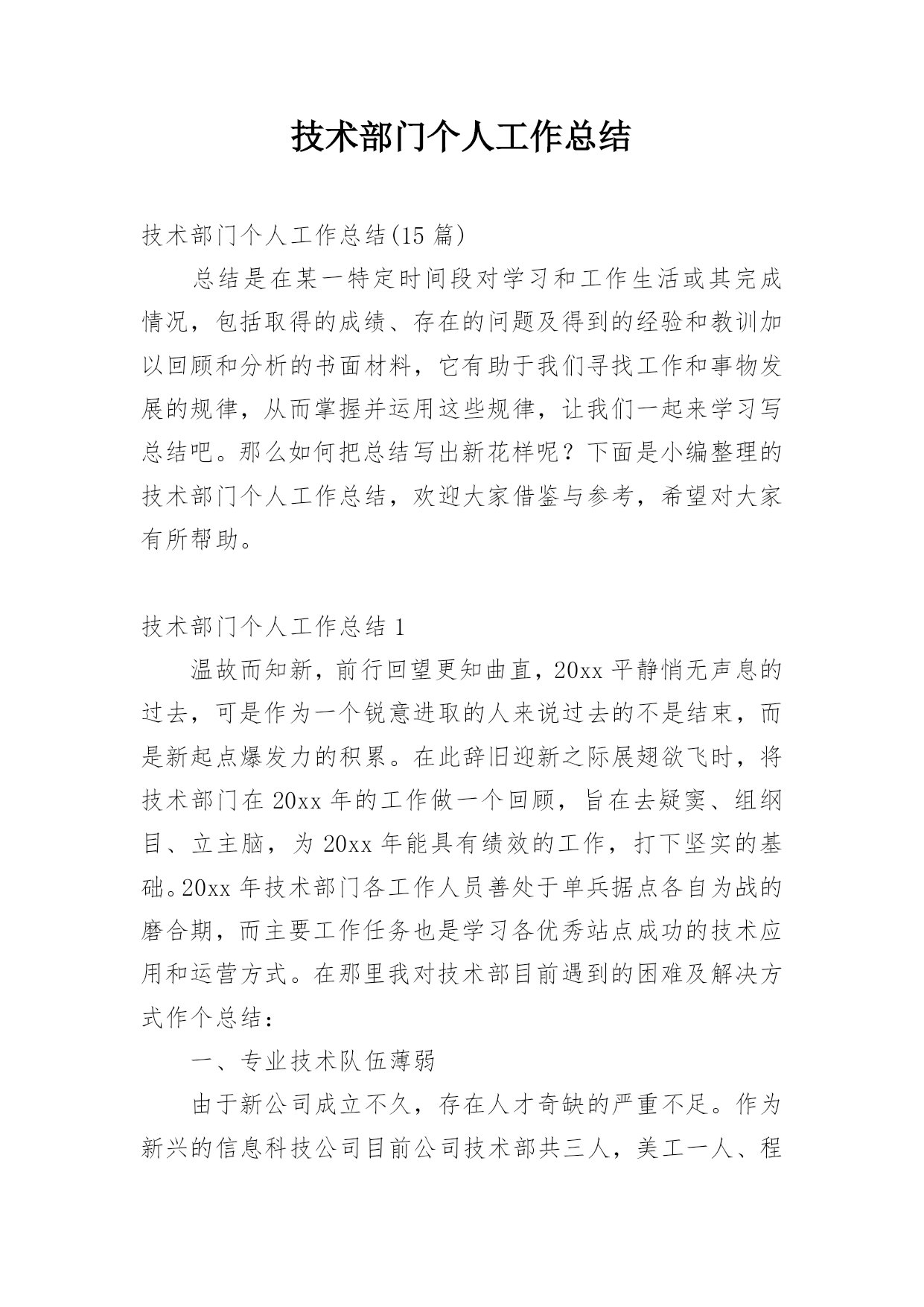 技术部门个人工作总结技术部门个人工作总结(15篇)总结是在某一特定时间段对学习和工作生活或其完成情况,包括取得的成绩、存在的问题及得到的经验和教训加以回顾和分析的书面材料,它有助于我们寻找工作和事物发展的规律,从而掌握并运用这些规律,让我们一起来学习写总结吧。那么如何把总结写出新花样呢?下面是小编整理的技术部门个人工作总结,欢迎大家借鉴与参考,希望对大家有所帮助。技术部门个人工作总结1温故而知新,前行回望更知曲直,20xx平静悄无声息的过去,可是作为一个锐意进取的人来说过去的不是结束,而是新起点爆发力的积