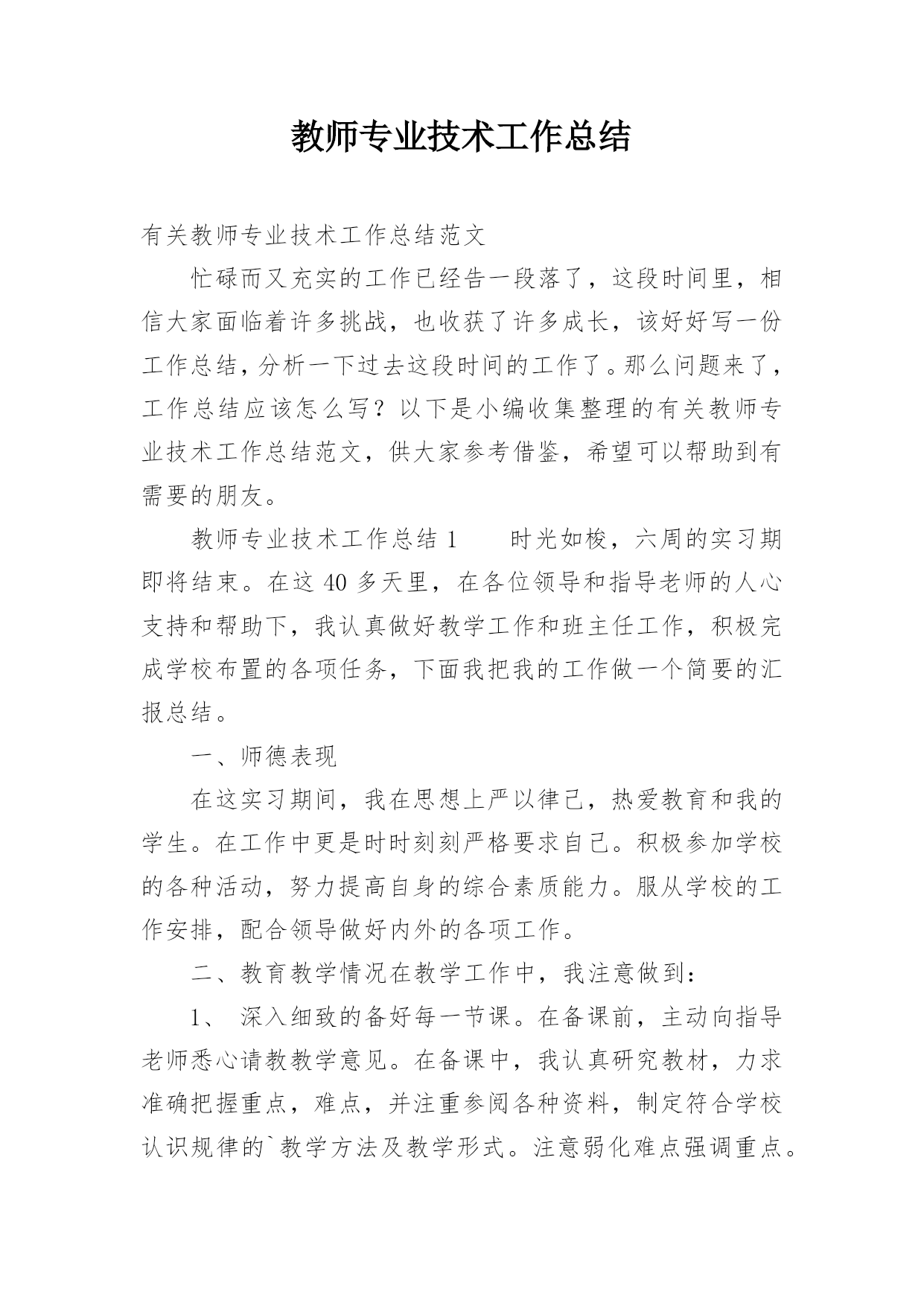 教师专业技术工作总结有关教师专业技术工作总结范文忙碌而又充实的工作已经告一段落了,这段时间里,相信大家面临着许多挑战,也收获了许多成长,该好好写一份工作总结,分析一下过去这段时间的工作了。那么问题来了,工作总结应该怎么写?以下是小编收集整理的有关教师专业技术工作总结范文,供大家参考借鉴,希望可以帮助到有需要的朋友。教师专业技术工作总结1时光如梭,六周的实习期即将结束。在这40多天里,在各位领导和指导老师的人心支持和帮助下,我认真做好教学工作和班主任工作,积极完成学校布置的各项任务,下面我把我的工作做一个简