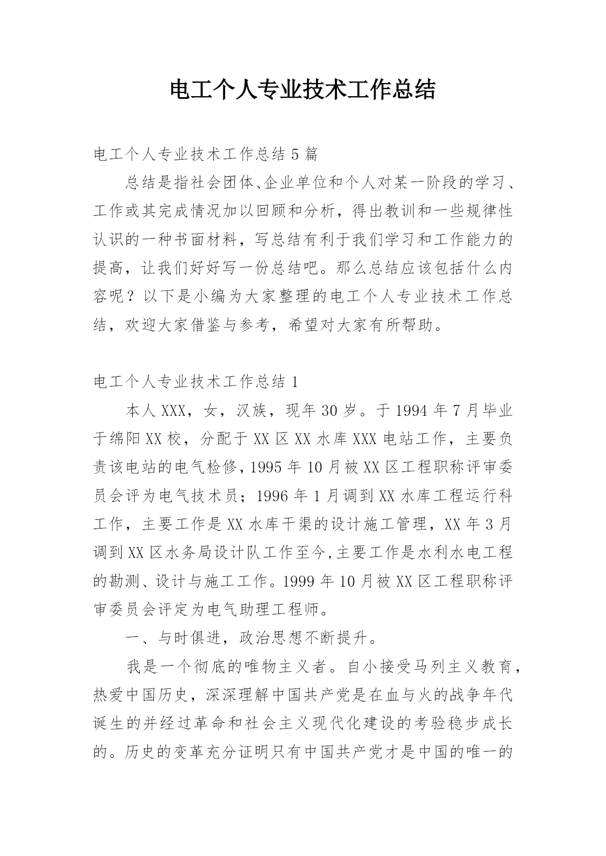 电工个人专业技术工作总结电工个人专业技术工作总结5篇总结是指社会团体、企业单位和个人对某一阶段的学习、工作或其完成情况加以回顾和分析,得出教训和一些规律性认识的一种书面材料,写总结有利于我们学习和工作能力的提高,让我们好好写一份总结吧。那么总结应该包括什么内容呢?以下是小编为大家整理的电工个人专业技术工作总结,欢迎大家借鉴与参考,希望对大家有所帮助。电工个人专业技术工作总结1本人XXX,女,汉族,现年30岁。于1994年7月毕业于绵阳XX校,分配于XX区XX水库XXX电站工作,主要负责该电站的电气检修,1