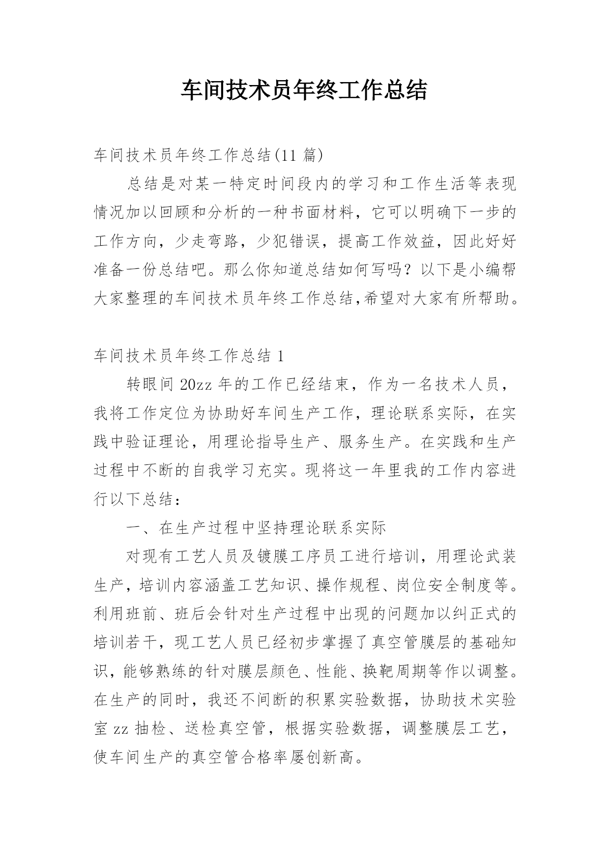 车间技术员年终工作总结车间技术员年终工作总结(11篇)总结是对某一特定时间段内的学习和工作生活等表现情况加以回顾和分析的一种书面材料,它可以明确下一步的工作方向,少走弯路,少犯错误,提高工作效益,因此好好准备一份总结吧。那么你知道总结如何写吗?以下是小编帮大家整理的车间技术员年终工作总结,希望对大家有所帮助。车间技术员年终工作总结1转眼间20zz年的工作已经结束,作为一名技术人员,我将工作定位为协助好车间生产工作,理论联系实际,在实践中验证理论,用理论指导生产、服务生产。在实践和生产过程中不断的自我学习充