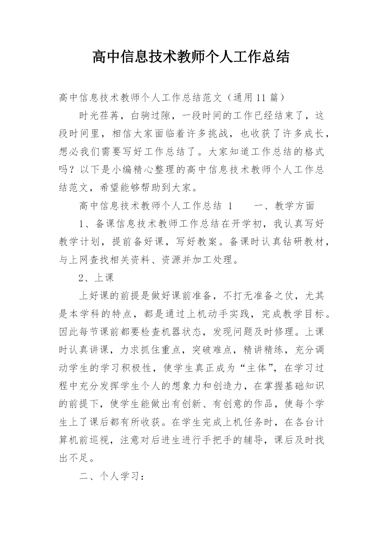 高中信息技术教师个人工作总结高中信息技术教师个人工作总结范文(通用11篇)时光荏苒,白驹过隙,一段时间的工作已经结束了,这段时间里,相信大家面临着许多挑战,也收获了许多成长,想必我们需要写好工作总结了。大家知道工作总结的格式吗?以下是小编精心整理的高中信息技术教师个人工作总结范文,希望能够帮助到大家。高中信息技术教师个人工作总结1一、教学方面1、备课信息技术教师工作总结在开学初,我认真写好教学计划,提前备好课,写好教案。备课时认真钻研教材,与上网查找相关资料、资源并加工处理。2、上课上好课的前提是做好课前