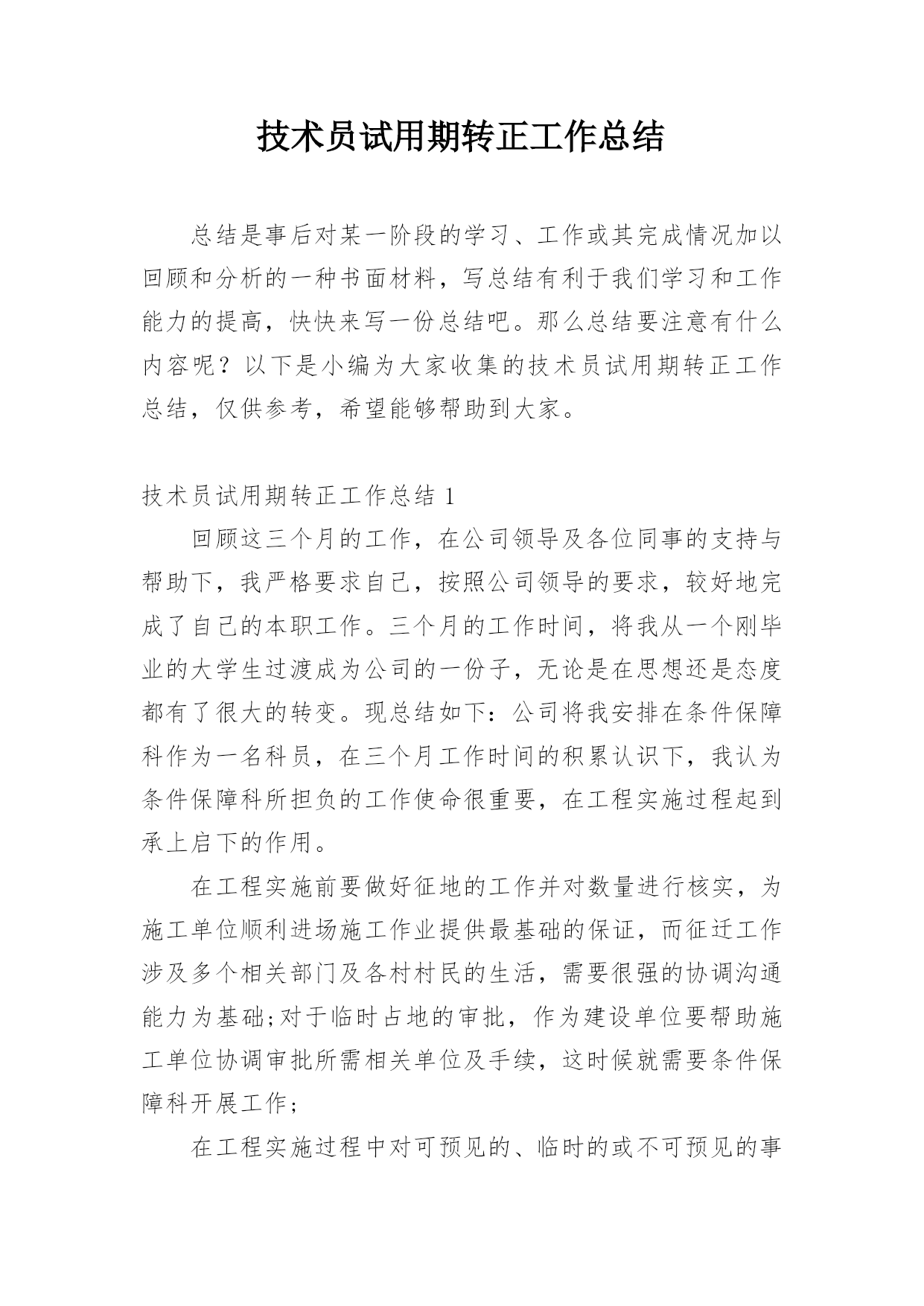 技术员试用期转正工作总结总结是事后对某一阶段的学习、工作或其完成情况加以回顾和分析的一种书面材料,写总结有利于我们学习和工作能力的提高,快快来写一份总结吧。那么总结要注意有什么内容呢?以下是小编为大家收集的技术员试用期转正工作总结,仅供参考,希望能够帮助到大家。技术员试用期转正工作总结1回顾这三个月的工作,在公司领导及各位同事的支持与帮助下,我严格要求自己,按照公司领导的要求,较好地完成了自己的本职工作。三个月的工作时间,将我从一个刚毕业的大学生过渡成为公司的一份子,无论是在思想还是态度都有了很大的转变。
