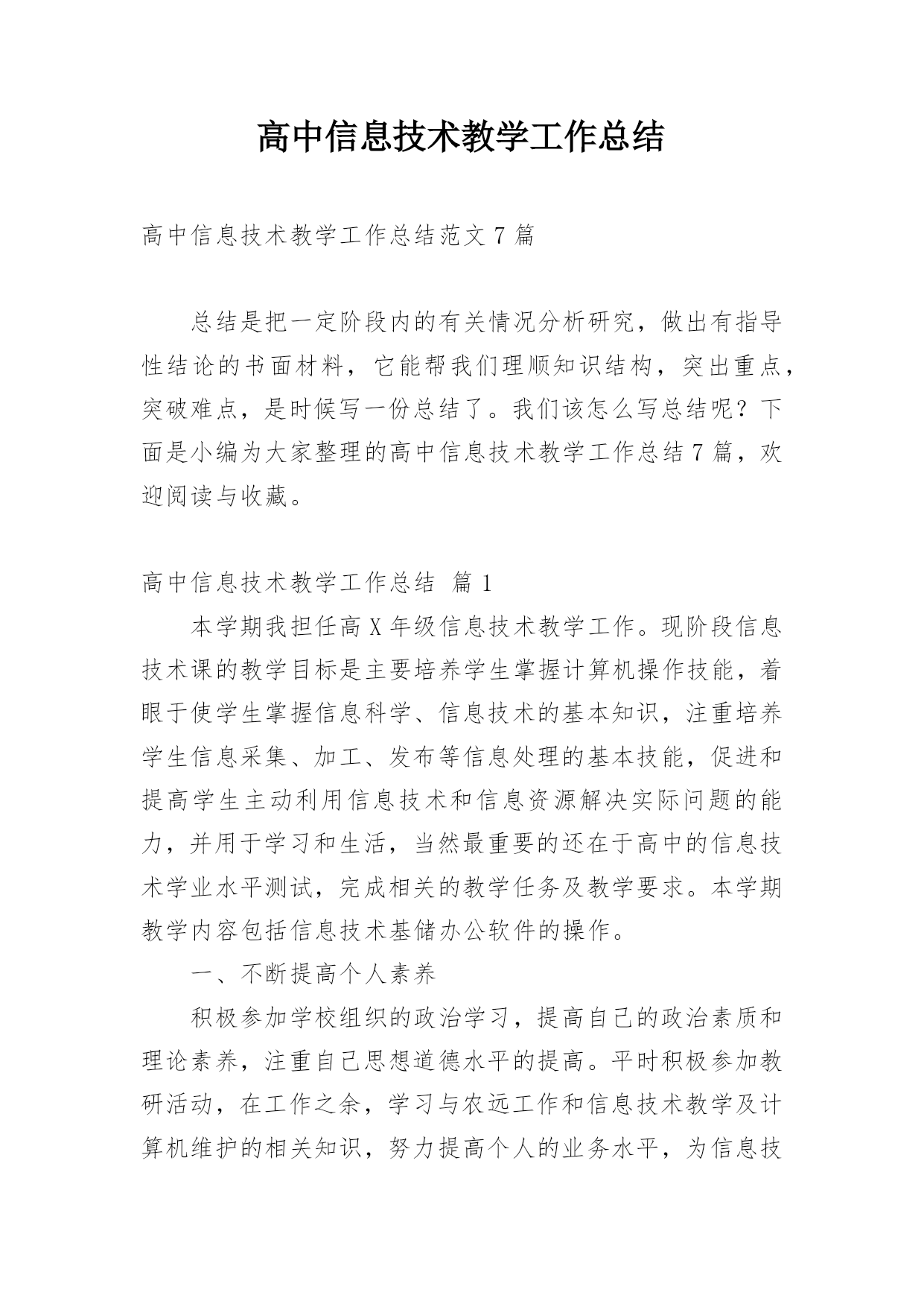 高中信息技术教学工作总结高中信息技术教学工作总结范文7篇总结是把一定阶段内的有关情况分析研究,做出有指导性结论的书面材料,它能帮我们理顺知识结构,突出重点,突破难点,是时候写一份总结了。我们该怎么写总结呢?下面是小编为大家整理的高中信息技术教学工作总结7篇,欢迎阅读与收藏。高中信息技术教学工作总结篇1本学期我担任高X年级信息技术教学工作。现阶段信息技术课的教学目标是主要培养学生掌握计算机操作技能,着眼于使学生掌握信息科学、信息技术的基本知识,注重培养学生信息采集、加工、发布等信息处理的基本技能,促进和提高