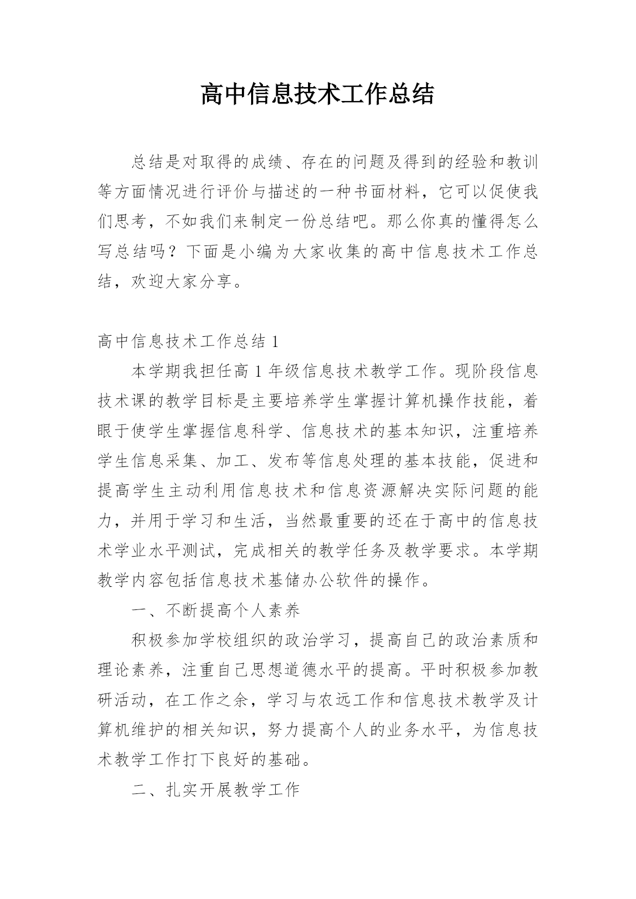 高中信息技术工作总结总结是对取得的成绩、存在的问题及得到的经验和教训等方面情况进行评价与描述的一种书面材料,它可以促使我们思考,不如我们来制定一份总结吧。那么你真的懂得怎么写总结吗?下面是小编为大家收集的高中信息技术工作总结,欢迎大家分享。高中信息技术工作总结1本学期我担任高1年级信息技术教学工作。现阶段信息技术课的教学目标是主要培养学生掌握计算机操作技能,着眼于使学生掌握信息科学、信息技术的基本知识,注重培养学生信息采集、加工、发布等信息处理的基本技能,促进和提高学生主动利用信息技术和信息资源解决实际问