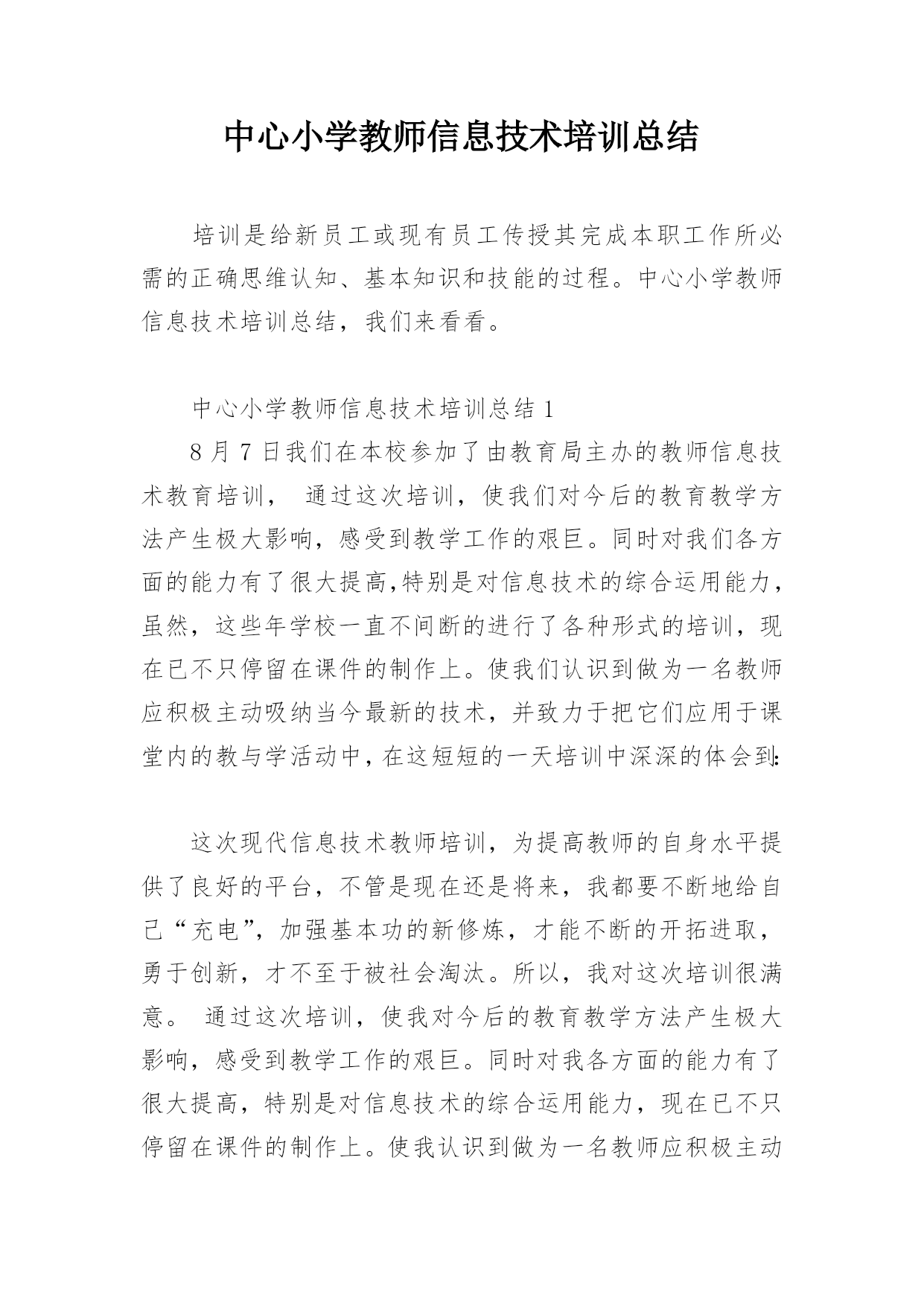 中心小学教师信息技术培训总结培训是给新员工或现有员工传授其完成本职工作所必需的正确思维认知、基本知识和技能的过程。中心小学教师信息技术培训总结,我们来看看。中心小学教师信息技术培训总结18月7日我们在本校参加了由教育局主办的教师信息技术教育培训,通过这次培训,使我们对今后的教育教学方法产生极大影响,感受到教学工作的艰巨。同时对我们各方面的能力有了很大提高,特别是对信息技术的综合运用能力,虽然,这些年学校一直不间断的进行了各种形式的培训,现在已不只停留在课件的制作上。使我们认识到做为一名教师应积极主动吸纳当