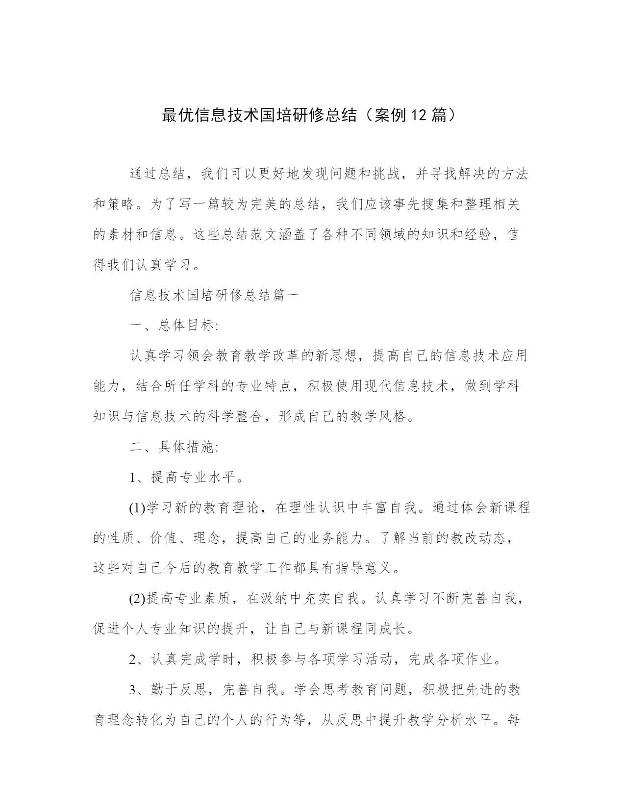 最优信息技术国培研修总结(案例12篇)通过总结,我们可以更好地发现问题和挑战,并寻找解决的方法和策略。为了写一篇较为完美的总结,我们应该事先搜集和整理相关的素材和信息。这些总结范文涵盖了各种不同领域的知识和经验,值得我们认真学习。信息技术国培研修总结篇一一、总体目标:认真学习领会教育教学改革的新思想,提高自己的信息技术应用能力,结合所任学科的专业特点,积极使用现代信息技术,做到学科知识与信息技术的科学整合,形成自己的教学风格。二、具体措施:1、提高专业水平。(1)学习新的教育理论,在理性认识中丰富自我。通