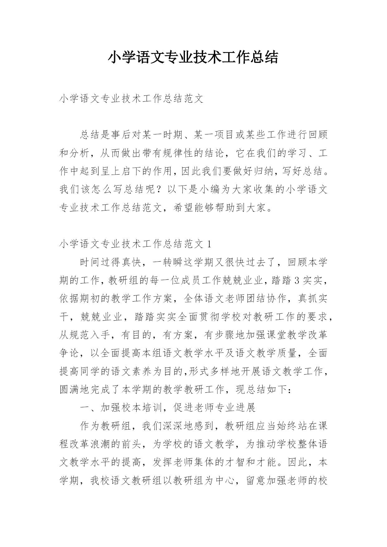 小学语文专业技术工作总结小学语文专业技术工作总结范文总结是事后对某一时期、某一项目或某些工作进行回顾和分析,从而做出带有规律性的结论,它在我们的学习、工作中起到呈上启下的作用,因此我们要做好归纳,写好总结。我们该怎么写总结呢?以下是小编为大家收集的小学语文专业技术工作总结范文,希望能够帮助到大家。小学语文专业技术工作总结范文1时间过得真快,一转瞬这学期又很快过去了,回顾本学期的工作,教研组的每一位成员工作兢兢业业,踏踏3实实,依据期初的教学工作方案,全体语文老师团结协作,真抓实干,兢兢业业,踏踏实实全面贯