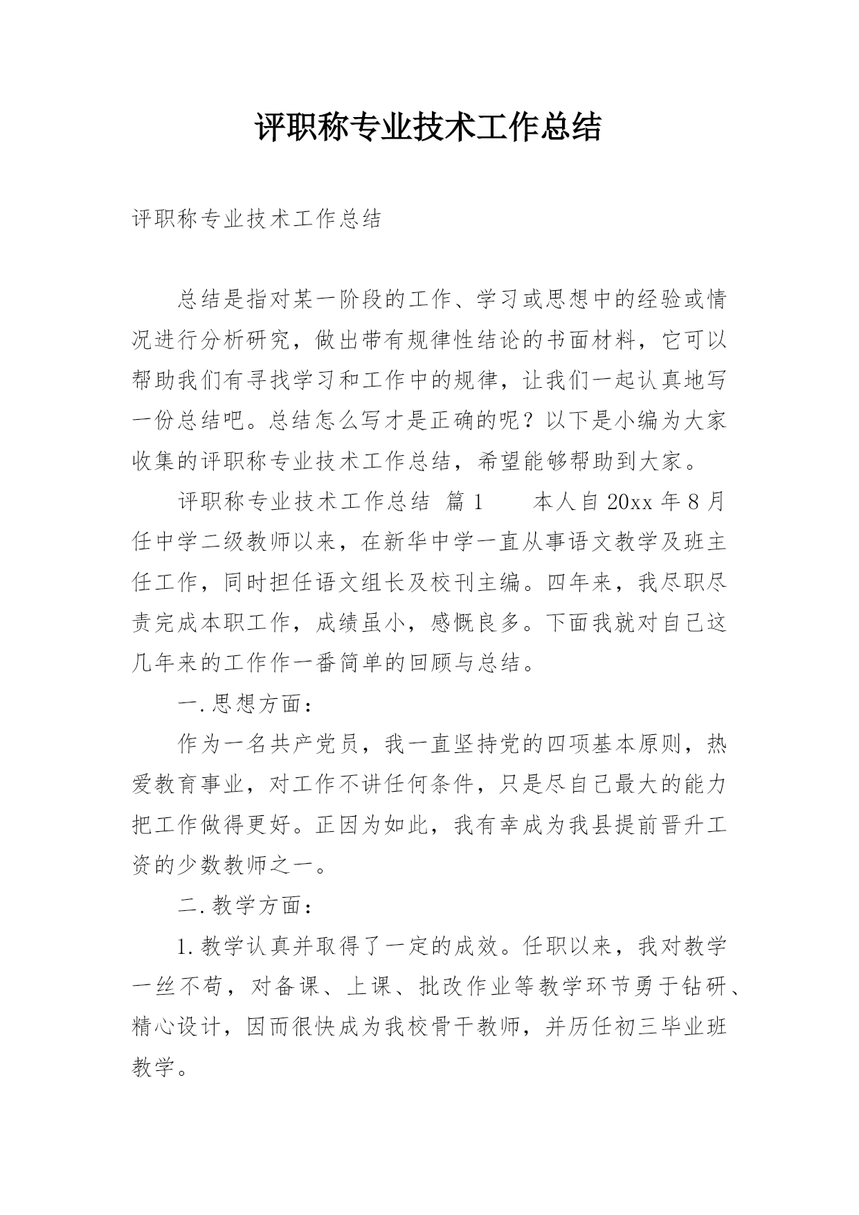 评职称专业技术工作总结评职称专业技术工作总结总结是指对某一阶段的工作、学习或思想中的经验或情况进行分析研究,做出带有规律性结论的书面材料,它可以帮助我们有寻找学习和工作中的规律,让我们一起认真地写一份总结吧。总结怎么写才是正确的呢?以下是小编为大家收集的评职称专业技术工作总结,希望能够帮助到大家。评职称专业技术工作总结篇1本人自20xx年8月任中学二级教师以来,在新华中学一直从事语文教学及班主任工作,同时担任语文组长及校刊主编。四年来,我尽职尽责完成本职工作,成绩虽小,感慨良多。下面我就对自己这几年来的工
