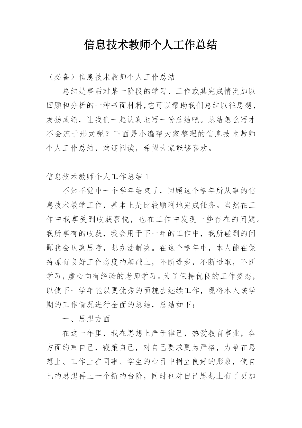 信息技术教师个人工作总结(必备)信息技术教师个人工作总结总结是事后对某一阶段的学习、工作或其完成情况加以回顾和分析的一种书面材料,它可以帮助我们总结以往思想,发扬成绩,让我们一起认真地写一份总结吧。总结怎么写才不会流于形式呢?下面是小编帮大家整理的信息技术教师个人工作总结,欢迎阅读,希望大家能够喜欢。信息技术教师个人工作总结1不知不觉中一个学年结束了,回顾这个学年所从事的信息技术教学工作,基本上是比较顺利地完成任务。当然在工作中我享受到收获喜悦,也在工作中发现一些存在的问题。我所享有的收获,我会用于下一年