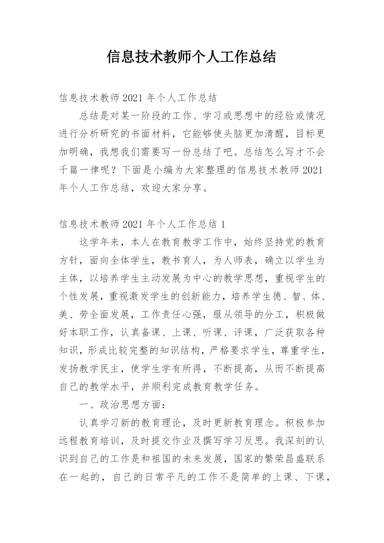 信息技术教师个人工作总结信息技术教师2021年个人工作总结总结是对某一阶段的工作、学习或思想中的经验或情况进行分析研究的书面材料,它能够使头脑更加清醒,目标更加明确,我想我们需要写一份总结了吧。总结怎么写才不会千篇一律呢?下面是小编为大家整理的信息技术教师2021年个人工作总结,欢迎大家分享。信息技术教师2021年个人工作总结1这学年来,本人在教育教学工作中,始终坚持党的教育方针,面向全体学生,教书育人,为人师表,确立以学生为主体,以培养学生主动发展为中心的教学思想,重视学生的个性发展,重视激发学生的创新