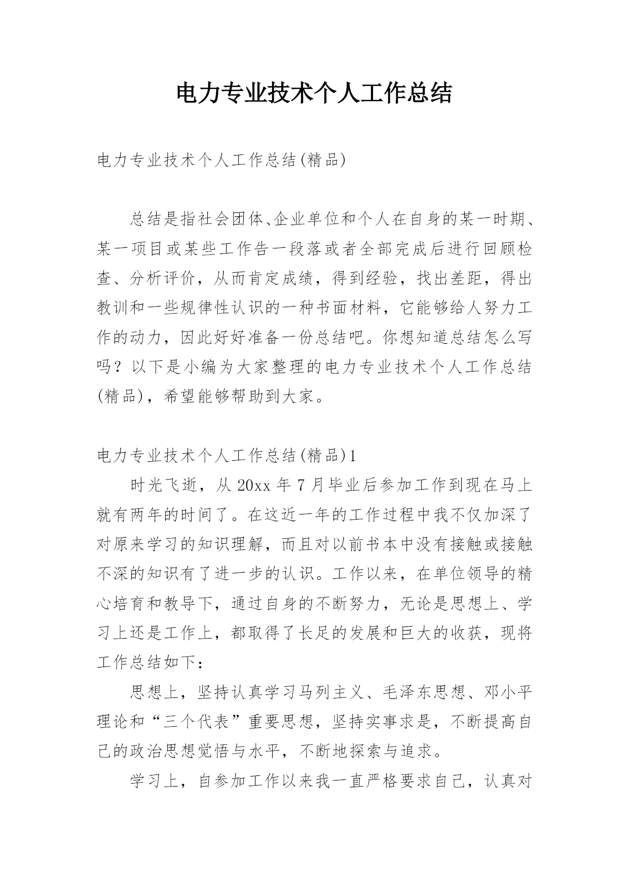 电力专业技术个人工作总结电力专业技术个人工作总结(精品)总结是指社会团体、企业单位和个人在自身的某一时期、某一项目或某些工作告一段落或者全部完成后进行回顾检查、分析评价,从而肯定成绩,得到经验,找出差距,得出教训和一些规律性认识的一种书面材料,它能够给人努力工作的动力,因此好好准备一份总结吧。你想知道总结怎么写吗?以下是小编为大家整理的电力专业技术个人工作总结(精品),希望能够帮助到大家。电力专业技术个人工作总结(精品)1时光飞逝,从20xx年7月毕业后参加工作到现在马上就有两年的时间了。在这近一年的工作