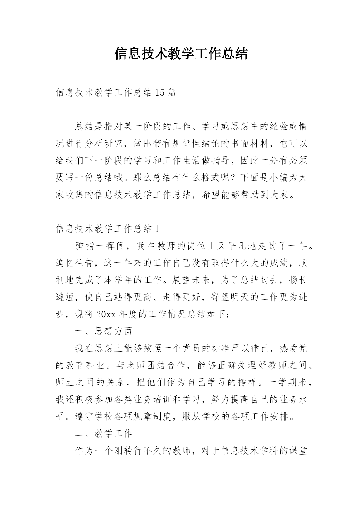 信息技术教学工作总结信息技术教学工作总结15篇总结是指对某一阶段的工作、学习或思想中的经验或情况进行分析研究,做出带有规律性结论的书面材料,它可以给我们下一阶段的学习和工作生活做指导,因此十分有必须要写一份总结哦。那么总结有什么格式呢?下面是小编为大家收集的信息技术教学工作总结,希望能够帮助到大家。信息技术教学工作总结1弹指一挥间,我在教师的岗位上又平凡地走过了一年。追忆往昔,这一年来的工作自己没有取得什么大的成绩,顺利地完成了本学年的工作。展望未来,为了总结过去,扬长避短,使自己站得更高、走得更好,寄望