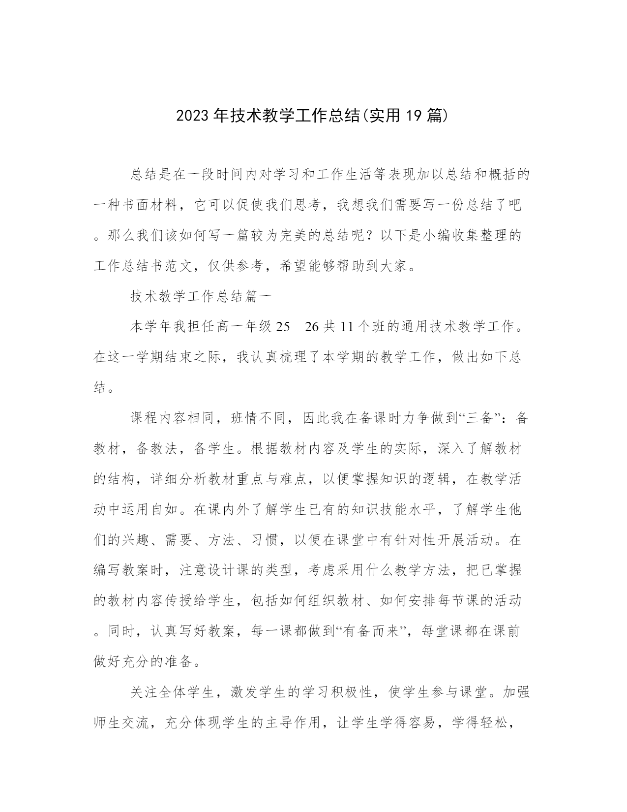 2023年技术教学工作总结(实用19篇)总结是在一段时间内对学习和工作生活等表现加以总结和概括的一种书面材料,它可以促使我们思考,我想我们需要写一份总结了吧。那么我们该如何写一篇较为完美的总结呢?以下是小编收集整理的工作总结书范文,仅供参考,希望能够帮助到大家。技术教学工作总结篇一本学年我担任高一年级25—26共11个班的通用技术教学工作。在这一学期结束之际,我认真梳理了本学期的教学工作,做出如下总结。课程内容相同,班情不同,因此我在备课时力争做到“三备”:备教材,备教法,备学生。根据教材内容及学生的实际