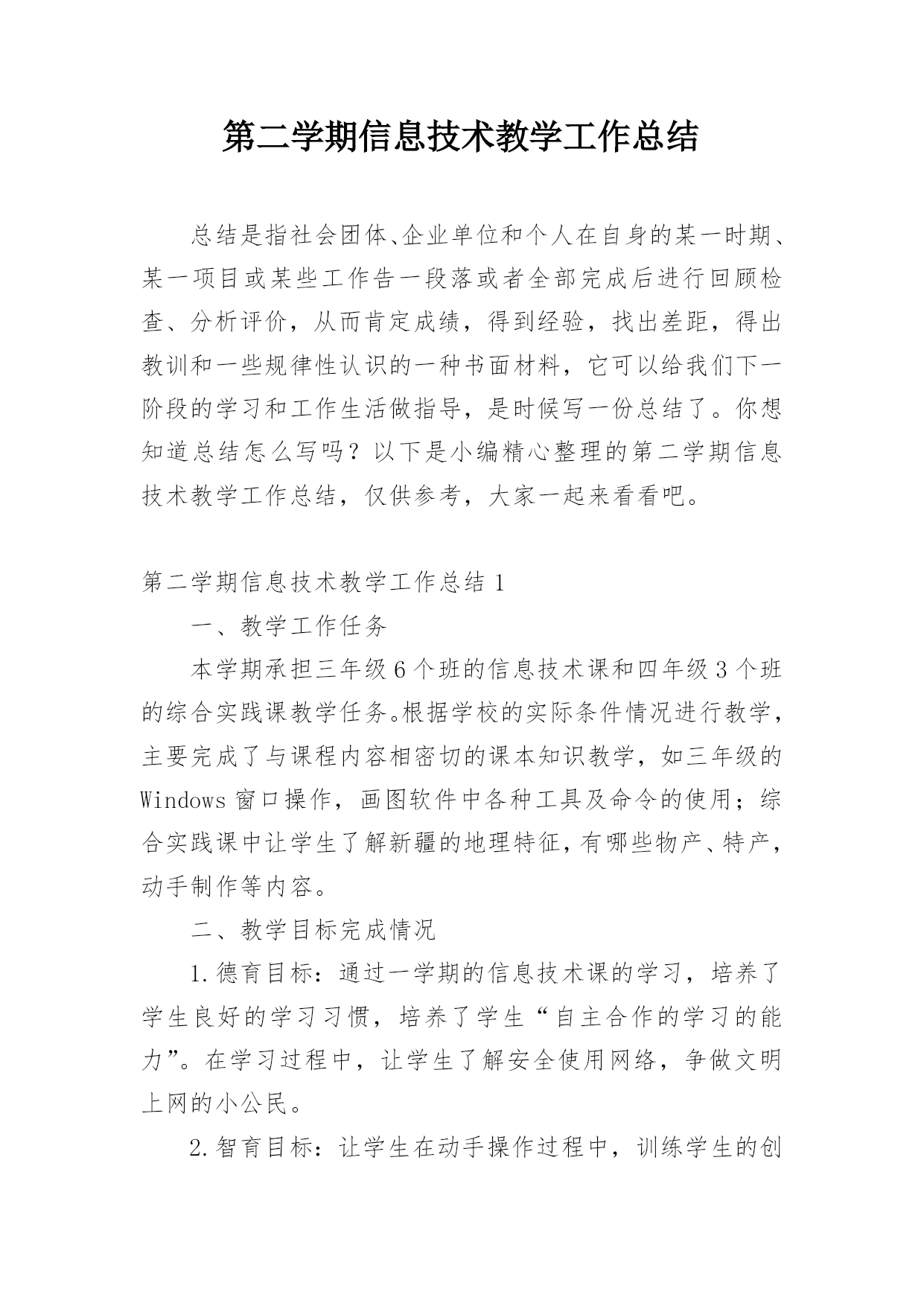 第二学期信息技术教学工作总结总结是指社会团体、企业单位和个人在自身的某一时期、某一项目或某些工作告一段落或者全部完成后进行回顾检查、分析评价,从而肯定成绩,得到经验,找出差距,得出教训和一些规律性认识的一种书面材料,它可以给我们下一阶段的学习和工作生活做指导,是时候写一份总结了。你想知道总结怎么写吗?以下是小编精心整理的第二学期信息技术教学工作总结,仅供参考,大家一起来看看吧。第二学期信息技术教学工作总结1一、教学工作任务本学期承担三年级6个班的信息技术课和四年级3个班的综合实践课教学任务。根据学校的实际