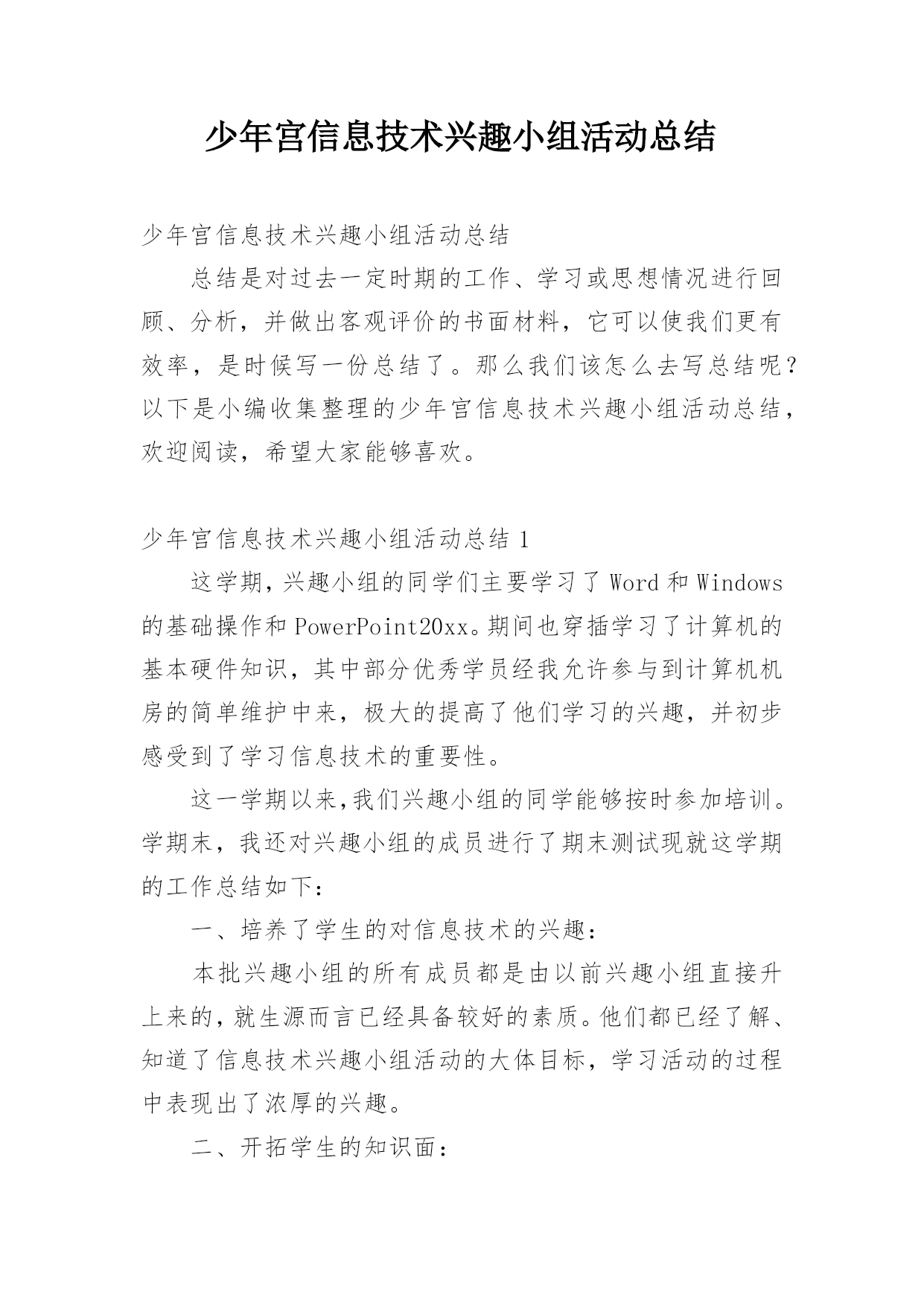 少年宫信息技术兴趣小组活动总结少年宫信息技术兴趣小组活动总结总结是对过去一定时期的工作、学习或思想情况进行回顾、分析,并做出客观评价的书面材料,它可以使我们更有效率,是时候写一份总结了。那么我们该怎么去写总结呢?以下是小编收集整理的少年宫信息技术兴趣小组活动总结,欢迎阅读,希望大家能够喜欢。少年宫信息技术兴趣小组活动总结1这学期,兴趣小组的同学们主要学习了Word和Windows的基础操作和PowerPoint20xx。期间也穿插学习了计算机的基本硬件知识,其中部分优秀学员经我允许参与到计算机机房的简单维