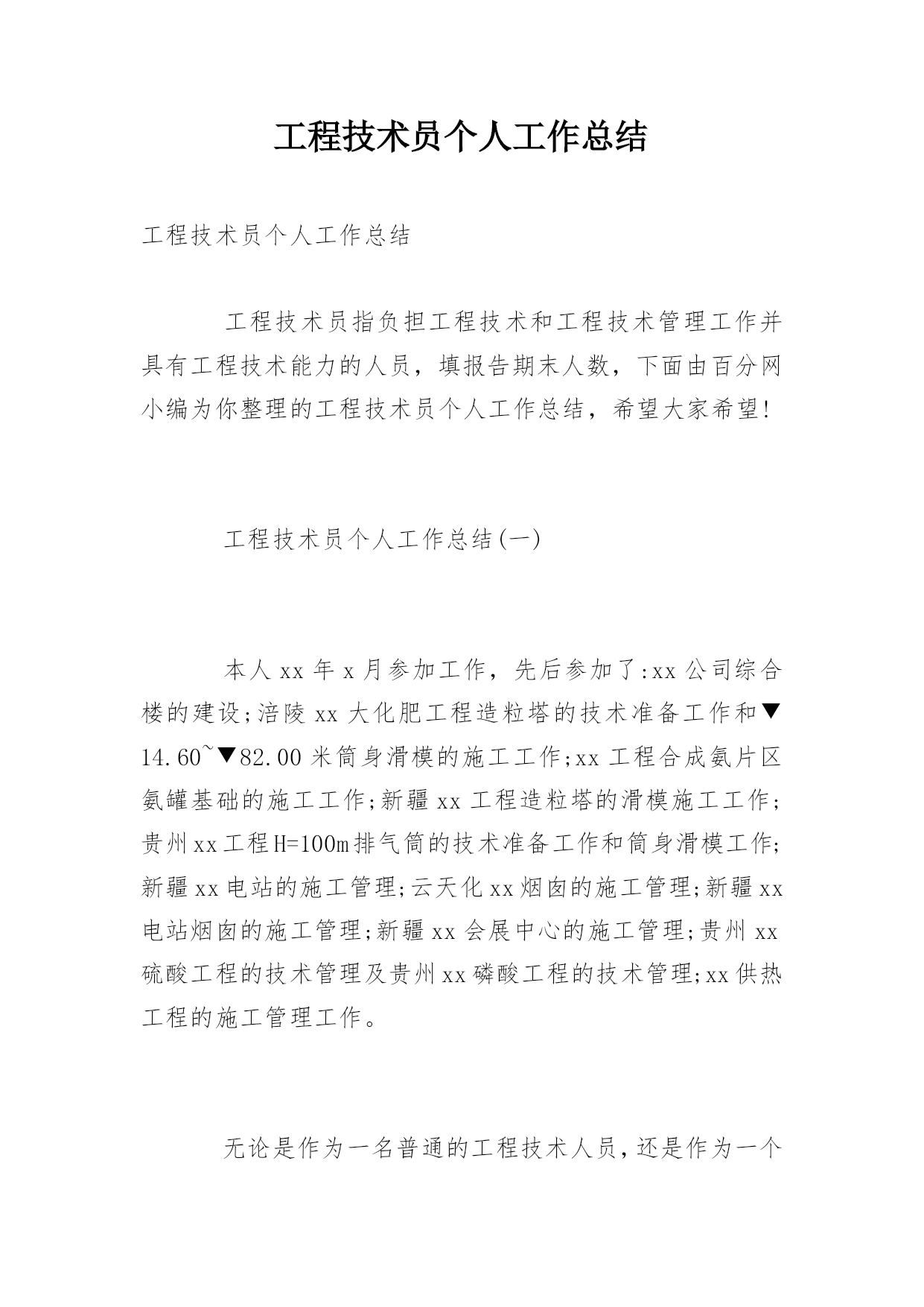 工程技术员个人工作总结工程技术员个人工作总结工程技术员指负担工程技术和工程技术管理工作并具有工程技术能力的人员,填报告期末人数,下面由百分网小编为你整理的工程技术员个人工作总结,希望大家希望!工程技术员个人工作总结(一)本人xx年x月参加工作,先后参加了:xx公司综合楼的建设;涪陵xx大化肥工程造粒塔的技术准备工作和▼14.60~▼82.00米筒身滑模的施工工作;xx工程合成氨片区氨罐基础的施工工作;新疆xx工程造粒塔的滑模施工工作;贵州xx工程H=100m排气筒的技术准备工作和筒身滑模工作;新疆xx电站