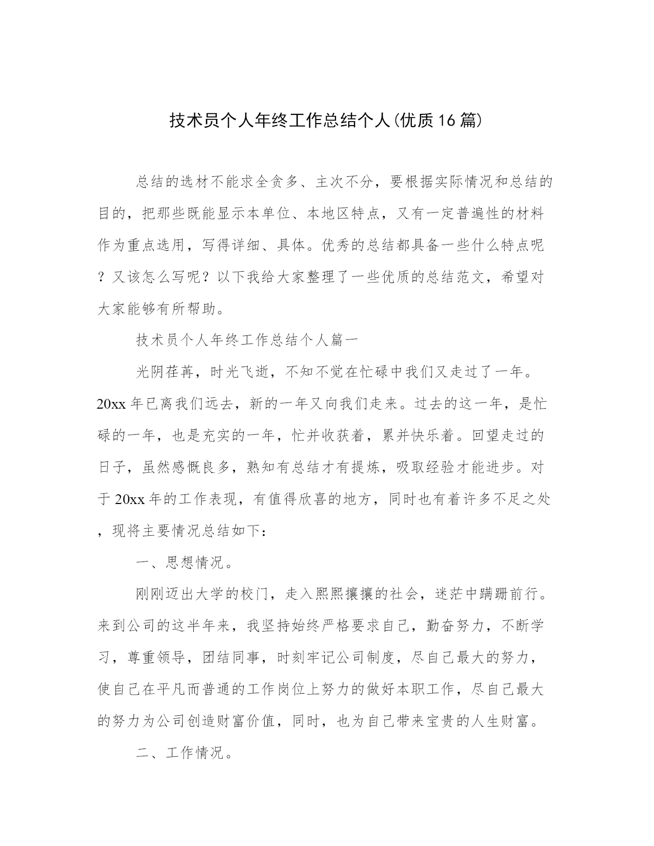 技术员个人年终工作总结个人(优质16篇)总结的选材不能求全贪多、主次不分,要根据实际情况和总结的目的,把那些既能显示本单位、本地区特点,又有一定普遍性的材料作为重点选用,写得详细、具体。优秀的总结都具备一些什么特点呢?又该怎么写呢?以下我给大家整理了一些优质的总结范文,希望对大家能够有所帮助。技术员个人年终工作总结个人篇一光阴荏苒,时光飞逝,不知不觉在忙碌中我们又走过了一年。20xx年已离我们远去,新的一年又向我们走来。过去的这一年,是忙碌的一年,也是充实的一年,忙并收获着,累并快乐着。回望走过的日子,虽
