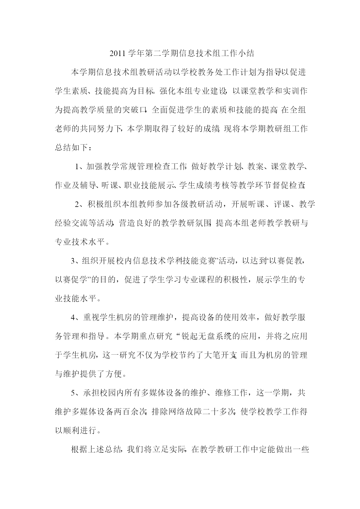 2011学年第二学期信息技术组工作小结本学期信息技术组教研活动以学校教务处工作计划为指导,以促进学生素质、技能提高为目标。强化本组专业建设,以课堂教学和实训作为提高教学质量的突破口,全面促进学生的素质和技能的提高。在全组老师的共同努力下,本学期取得了较好的成绩。现将本学期教研组工作总结如下:1、加强教学常规管理检查工作,做好教学计划、教案、课堂教学、作业及辅导、听课、职业技能展示、学生成绩考核等教学环节督促检查。2、积极组织本组教师参加各级教研活动,开展听课、评课、教学经验交流等活动,营造良好的教学教研氛