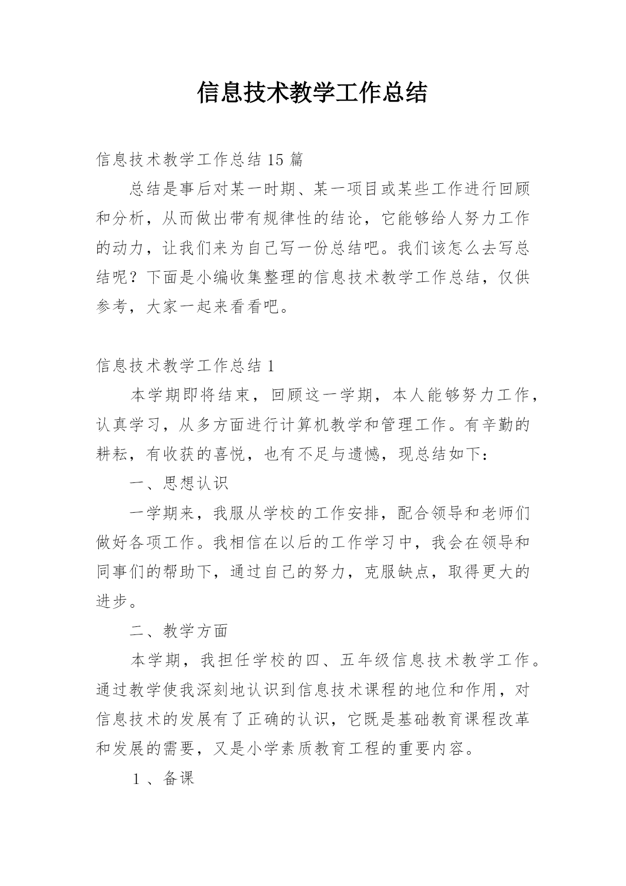 信息技术教学工作总结信息技术教学工作总结15篇总结是事后对某一时期、某一项目或某些工作进行回顾和分析,从而做出带有规律性的结论,它能够给人努力工作的动力,让我们来为自己写一份总结吧。我们该怎么去写总结呢?下面是小编收集整理的信息技术教学工作总结,仅供参考,大家一起来看看吧。信息技术教学工作总结1本学期即将结束,回顾这一学期,本人能够努力工作,认真学习,从多方面进行计算机教学和管理工作。有辛勤的耕耘,有收获的喜悦,也有不足与遗憾,现总结如下:一、思想认识一学期来,我服从学校的工作安排,配合领导和老师们做好各