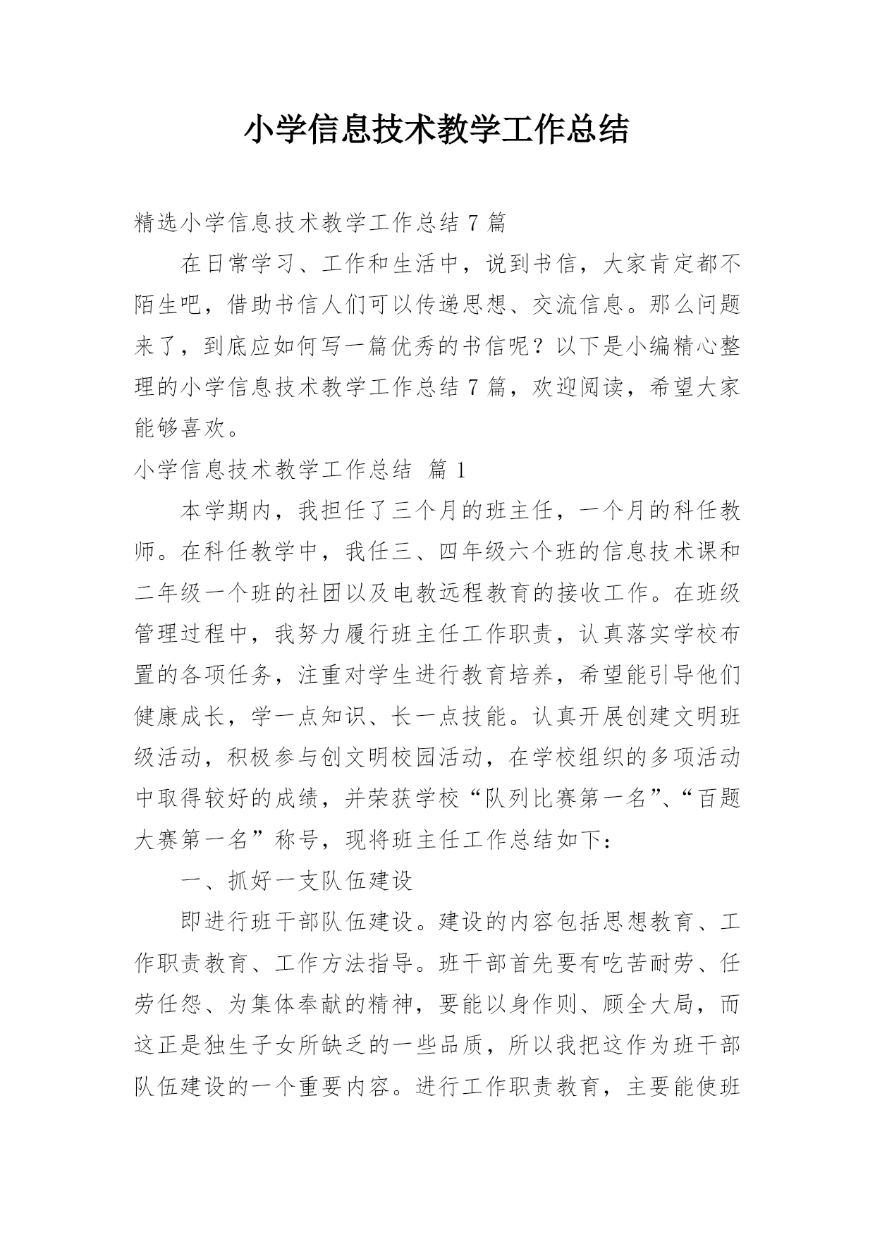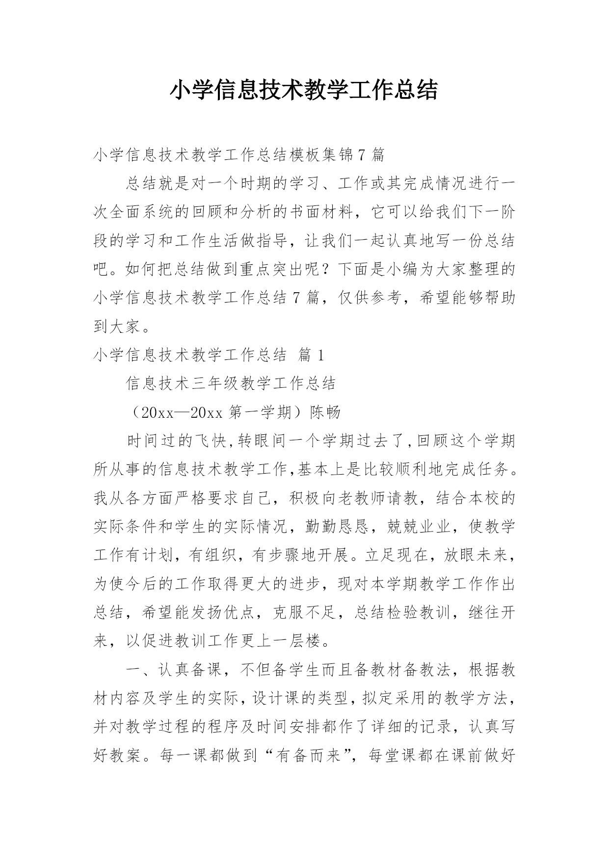 小学信息技术教学工作总结小学信息技术教学工作总结模板集锦7篇总结就是对一个时期的学习、工作或其完成情况进行一次全面系统的回顾和分析的书面材料,它可以给我们下一阶段的学习和工作生活做指导,让我们一起认真地写一份总结吧。如何把总结做到重点突出呢?下面是小编为大家整理的小学信息技术教学工作总结7篇,仅供参考,希望能够帮助到大家。小学信息技术教学工作总结篇1信息技术三年级教学工作总结(20xx—20xx第一学期)陈畅时间过的飞快,转眼间一个学期过去了,回顾这个学期所从事的信息技术教学工作,基本上是比较顺利地完成任